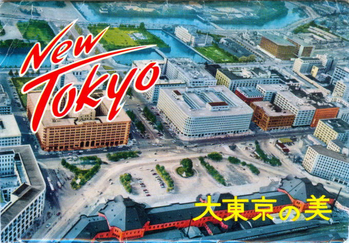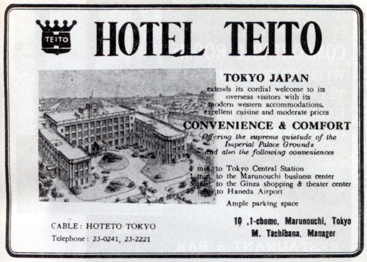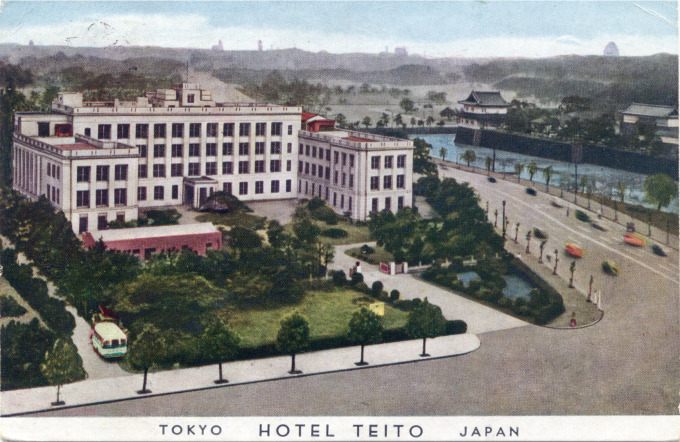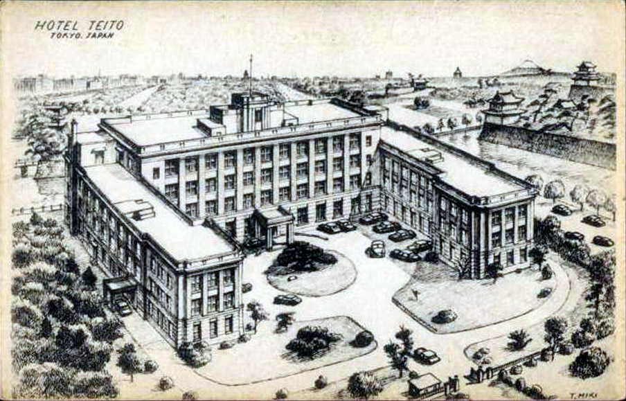 Hotel Teito, across from the Imperial Palace, near Otemachi Gate, with Mount Fuji on the horizon. The building had originally housed the Forestry Office of the Imperial Household when constructed c. 1910-1920. During the early years of the Occupation, it was refurbished and reopened in 1947 as a hotel. Although nationally-owned, the hotel was operated by Occupation forces until 1952. The site would be razed in 1960 and replaced with the Palace Hotel (1961-2009).