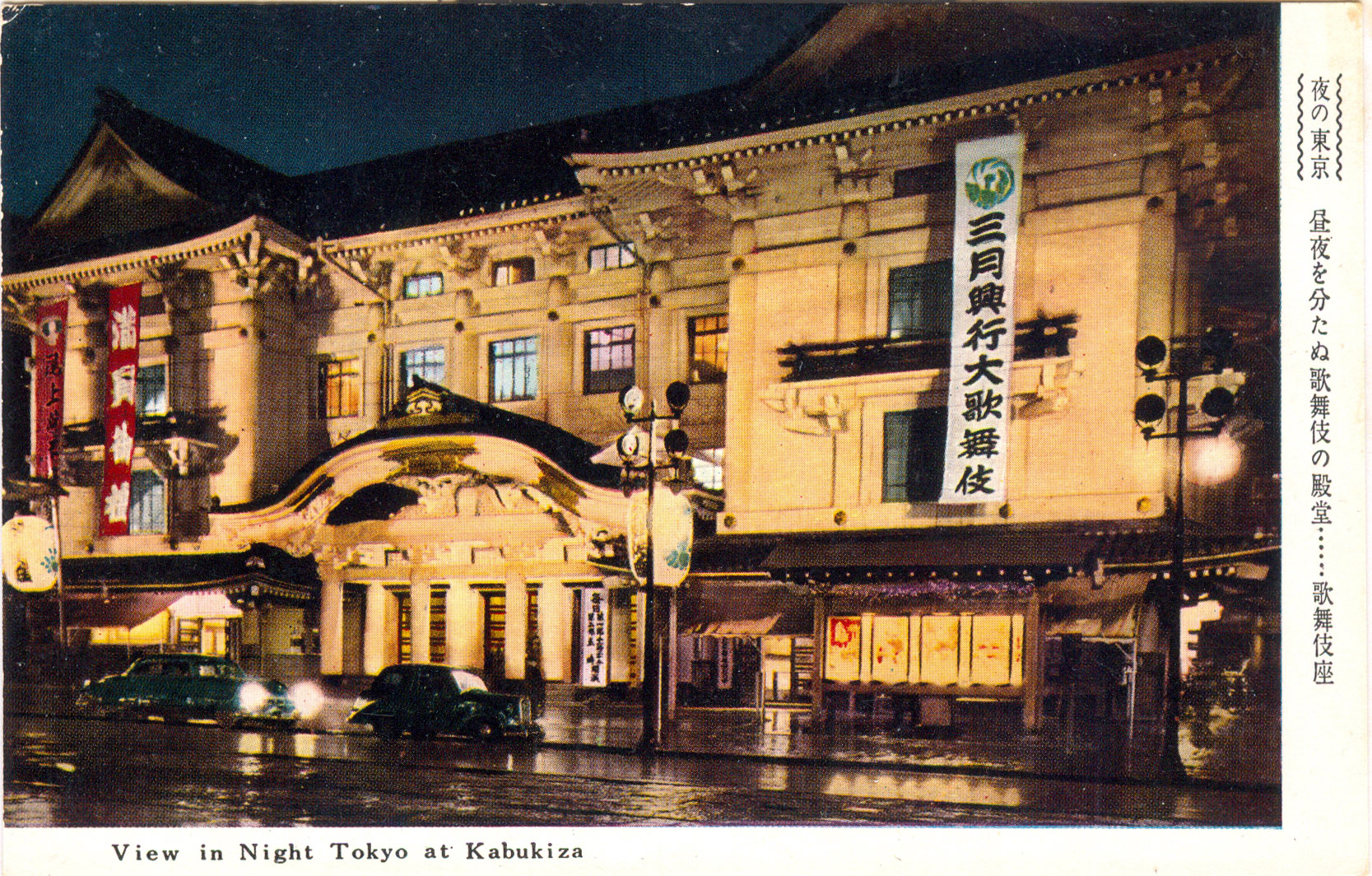 View in Night Tokyo at Kabukiza, Tokyo. The 1951 opening of the third Kabukiza, rebuilt from the post-earthquake theater that was then destroyed by wartime firebombing in 1945, marked the return of Kabuki post-war into Japanese theater and Japanese culture.