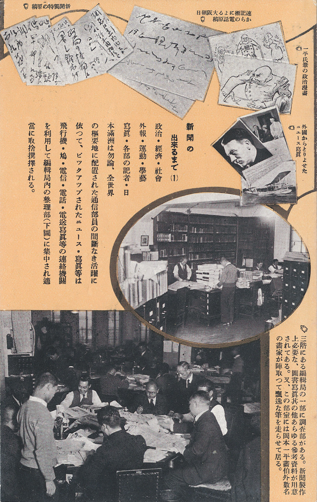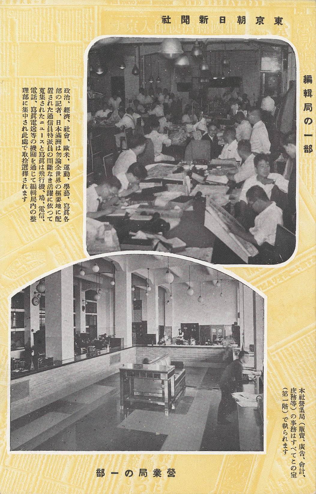 “How Newspapers Come to Be”, Asahi Shimbun operations postcard series, c. 1935. “Political, economic, social, British-American, athletic, academic, and artistic correspondents are stationed in key locations around the world as well as in Japan and Manchuria. (Lower photo:) All the head office operations (sales, marketing, accounting, general affairs, etc.) are handled in this 1st floor office.”