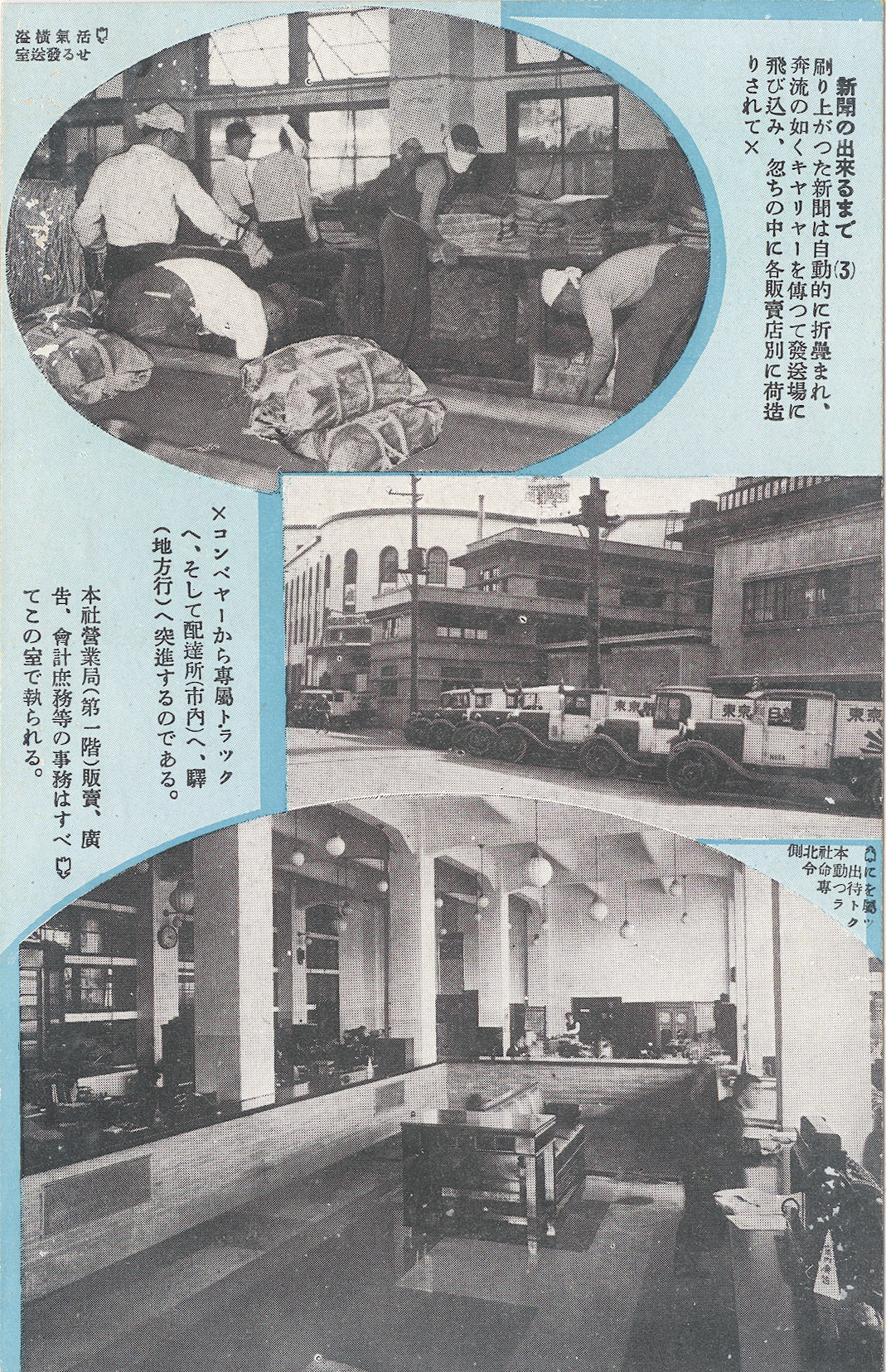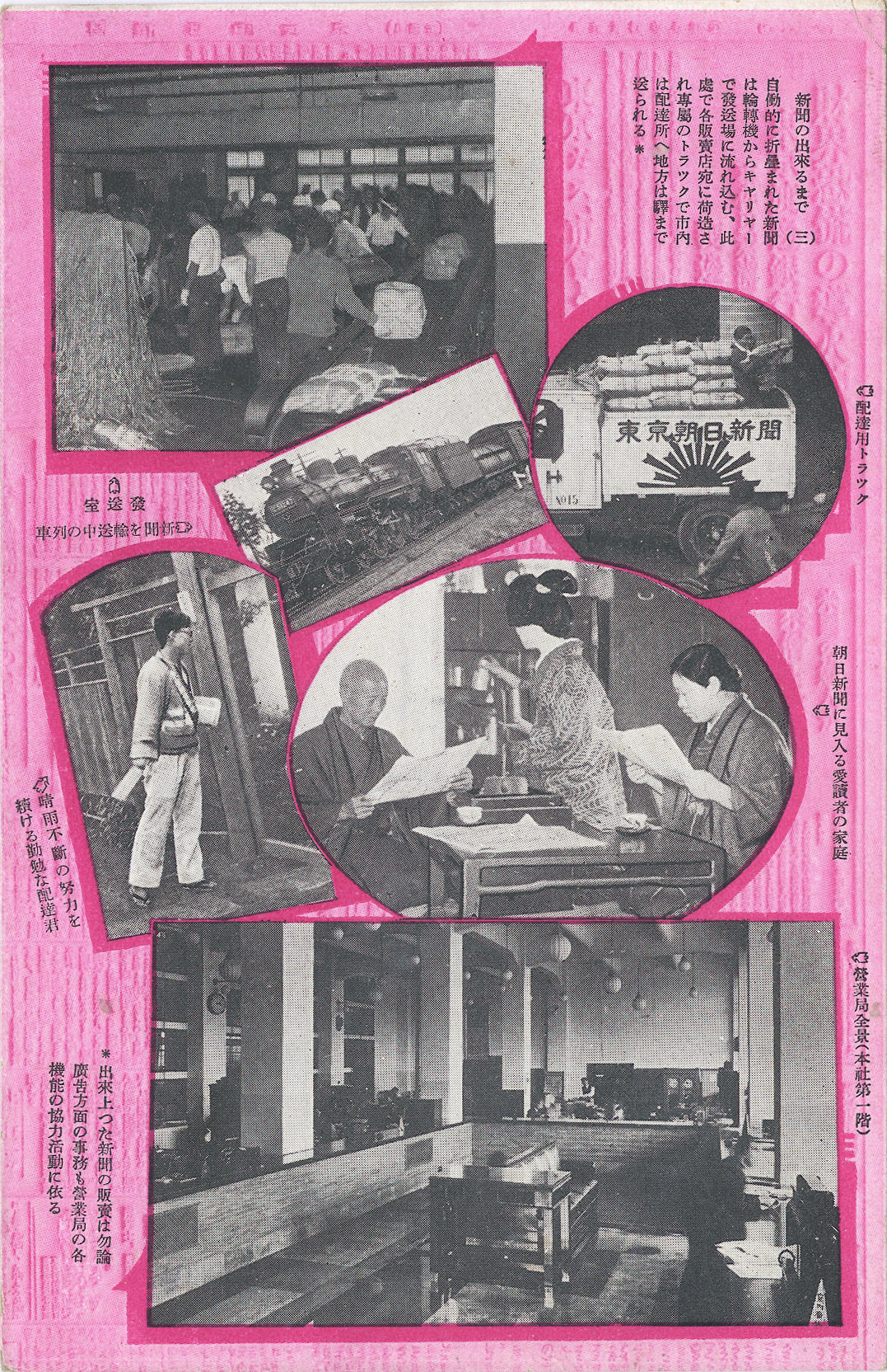 - “How Newspapers Come to Be”, Asahi Shimbun operations postcard series, c. 1935. “Four evening editions, nine morning editions, 340 local editions, and three Tokyo editions are distributed to 6,000 dealers throughout the country by 30 trucks dedicated to the company. The newspapers are sent out one after another.”