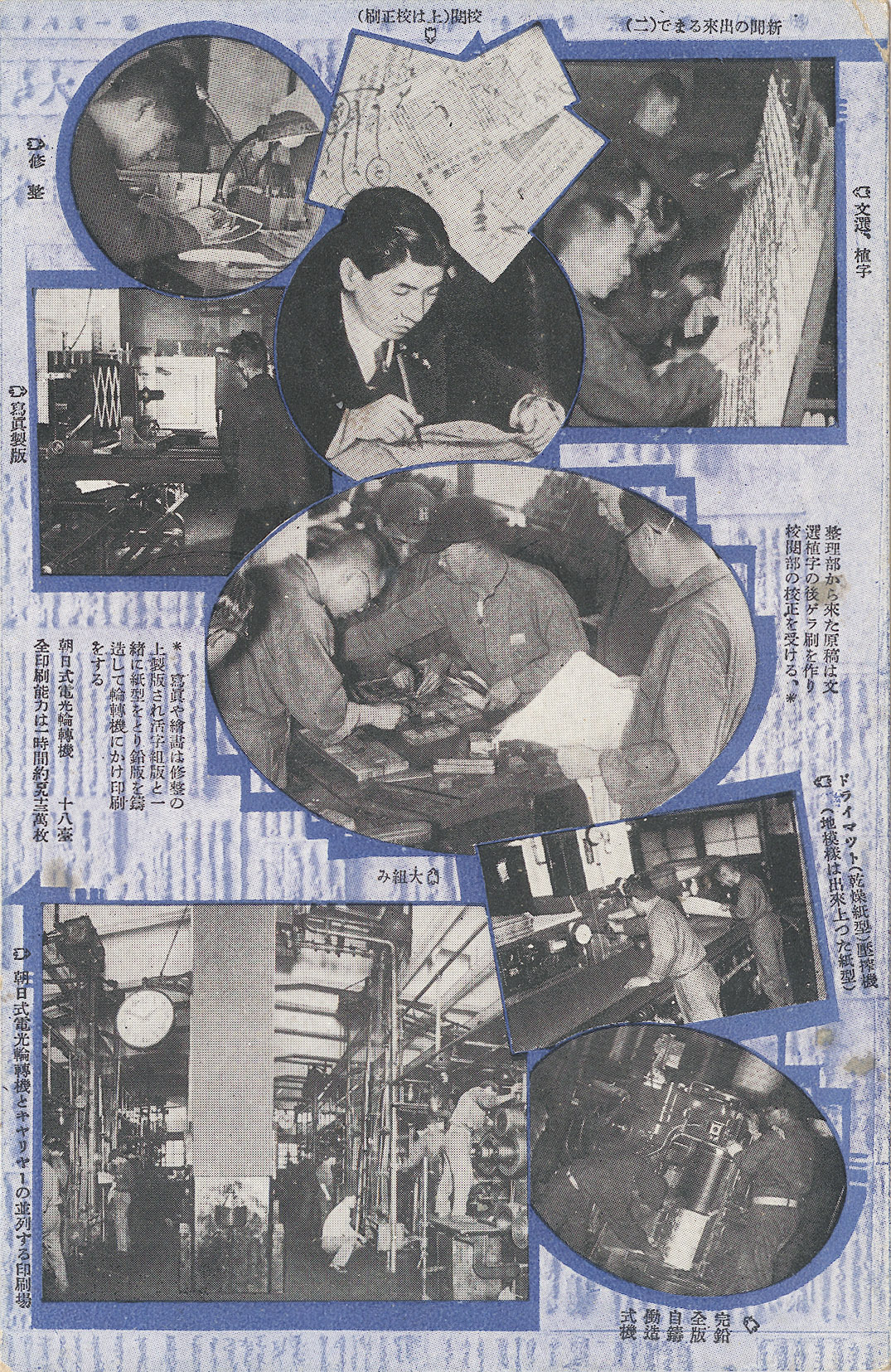 - “How Newspapers Come to Be”, Asahi Shimbun operations postcard series, c. 1935. “Manuscripts are typeset, printed, and proofread by the proofreading department. Lead plates are made and affixed to the printing press. Each of Asahi’s 18 rotary presses have a capacity of 1,930,000 impressions per hour.”