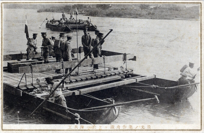 I.J.A. Engineering Corps, c. 1905. In the Imperial Japanese Army, each divisional bridging train was composed of 32 pontoons and 16 trestles.