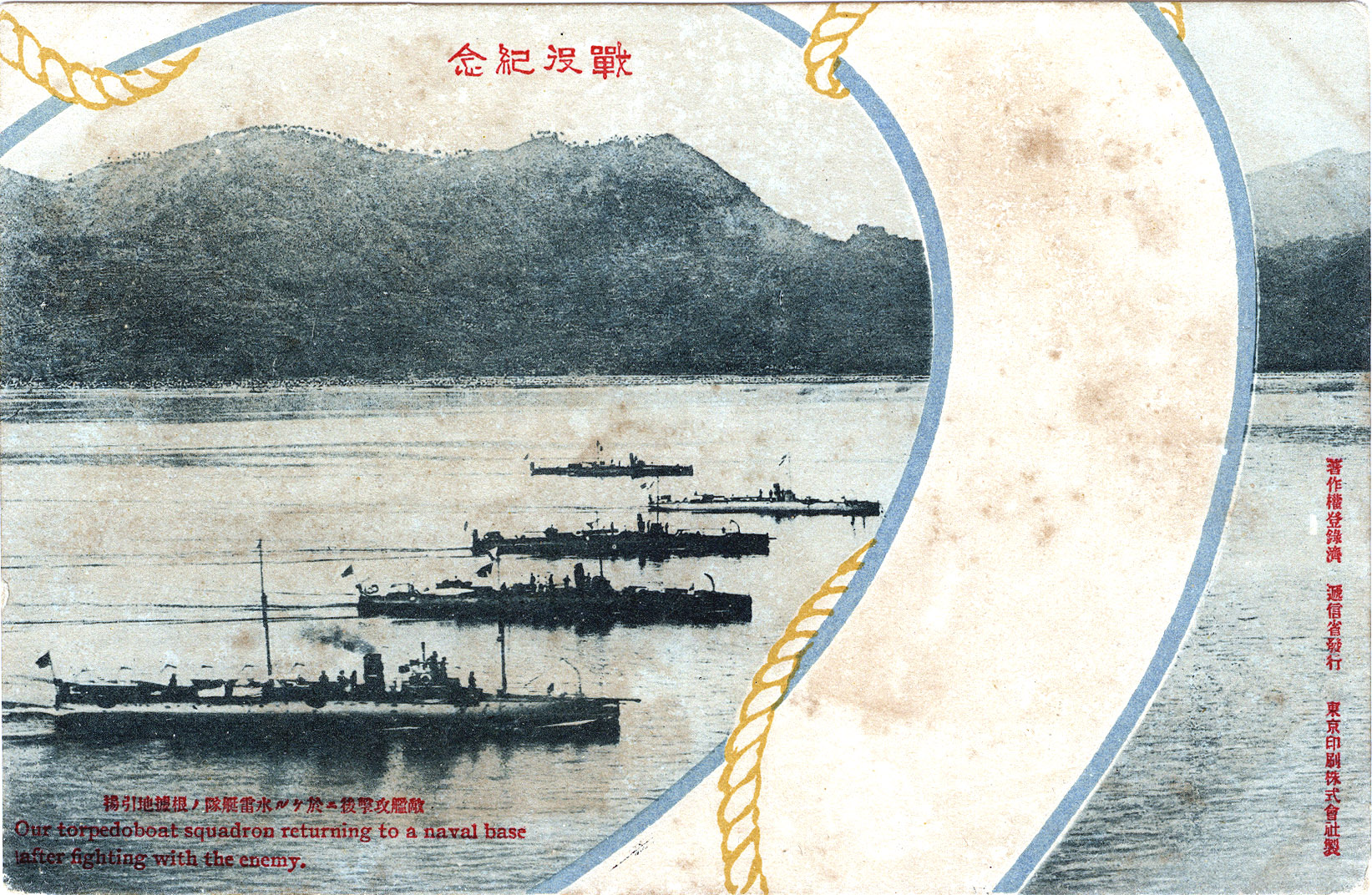 “Our torpedo boat squadron returning to a naval base after a night attack against the enemy”, I.J.N. torpedo boat squadron, Russo-Japanese War, c. 1904.