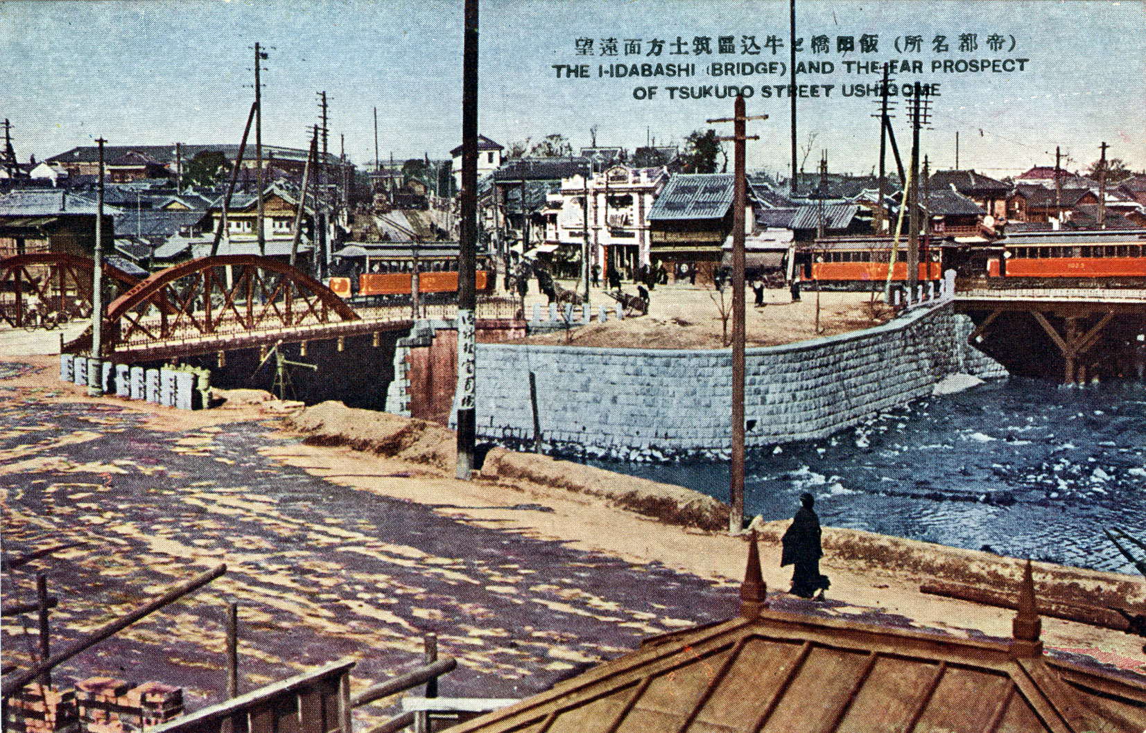 Iidabashi Bridge (left), erected in 1881, Ushigome, Tokyo, c. 1920, from the roof of Iidabashi Station and looking north toward Tsukodo-Hachiman. Up the rise, left-of-center, along what is now Meijiro-dori, was located the Koishikawa Arsenal where rifles and, later, airplanes, were produced for the Japanese Army from 1871 until the arsenal’s destruction by earthquake in 1923.