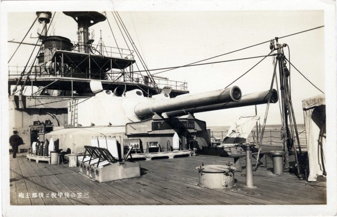 “Admiral Togo and his flag-ship ‘Mikasa‘,” c. 1910, constructed at Vickers shipyard in Barrow-in-Furness, UK, in 1898. After the Sino-Japanese War (1895), the Imperial Japanese Navy promulgated a ten-year naval build-up program with the construction of six battleships and six armored cruisers at its core. Lacking the technology and capability at the time to construct its own battleships, Japan turned to the United Kingdom for construction of the battleships. The design of Mikasa was a modified version of the Formidable-class battleships of the UK Royal Navy.