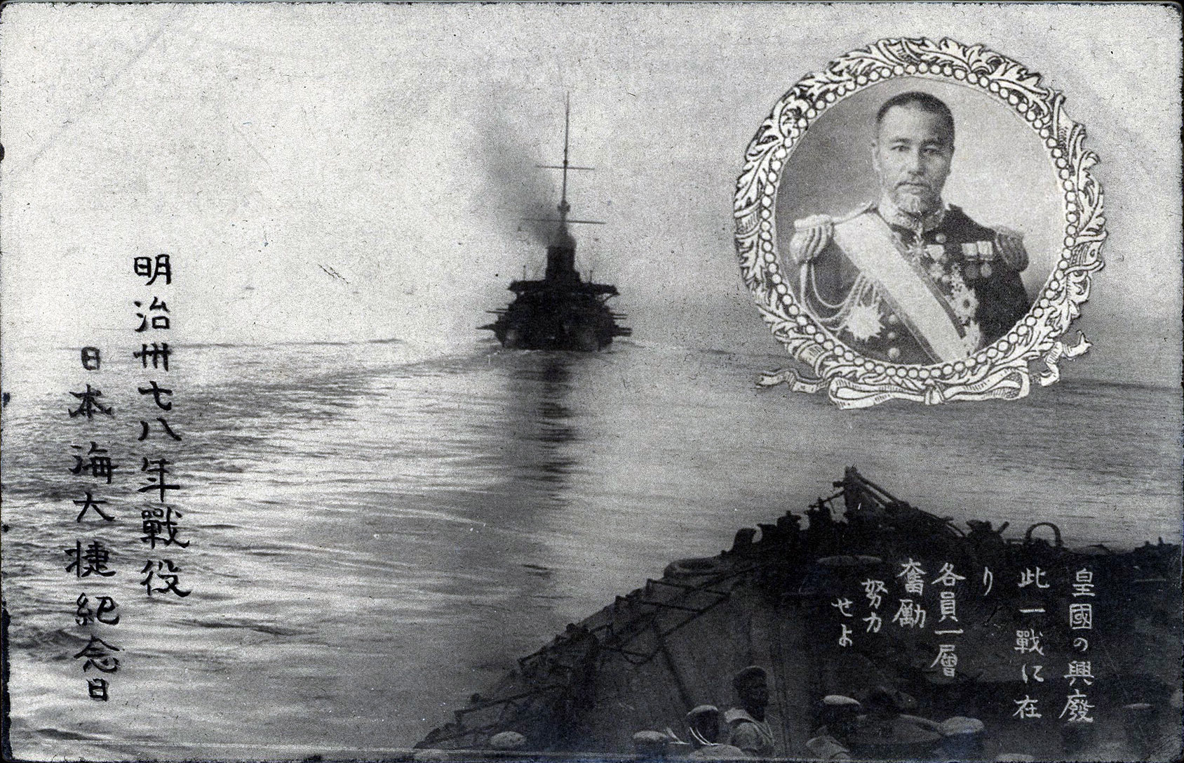 Battleship Mikasa and Combined Fleet Admiral Togo (inset photo), 1905, leading the line of battle against the Russian fleet at the Battle of Tsushima Straits, the first decisive sea battle fought by modern steel battleship fleets. At the lower right, the postcard is captioned “Being in the Empire’s world war, let each member work harder. In the 38th year of Meiji, the great victory of Japan.”