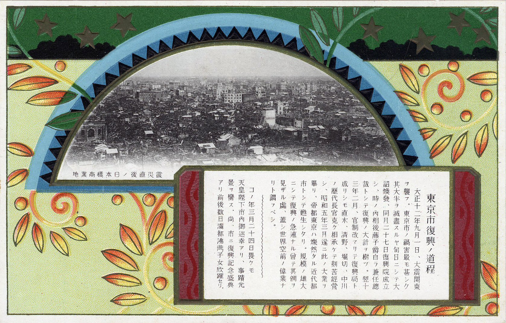 Imperial Capital Reconstruction Commemoration, c. 1930. Tokyo, and its predecessor Edo, had risen Phoenix-like from previous conflagrations and natural disasters. Fires were common enough in feudal times to be poetically termed “Flowers of Edo”. Previous to the 1923 Great Kanto Earthquake, Tokyo had experienced widespread damage from devestating fires (1872, 1914) and floods (1910).