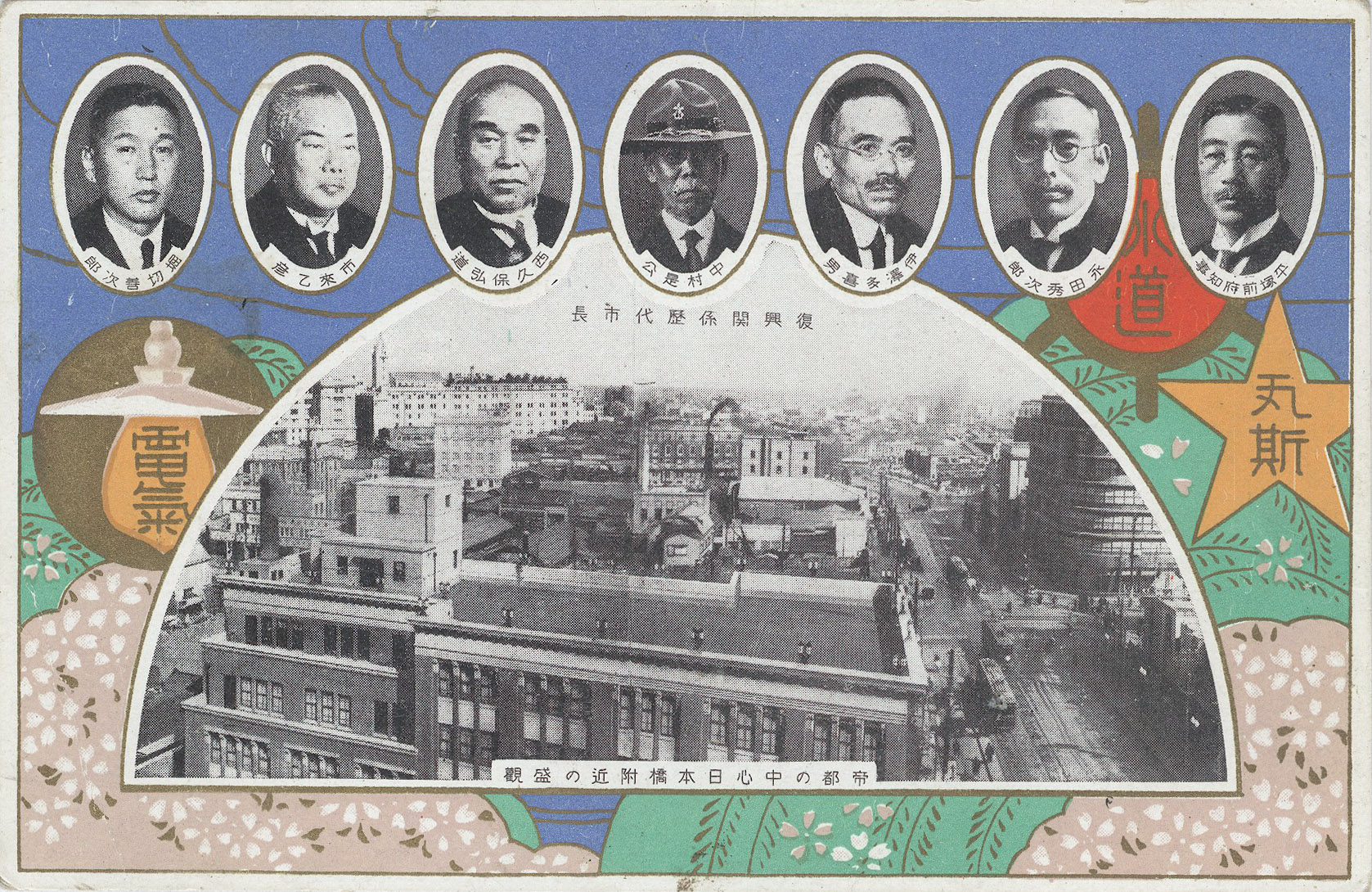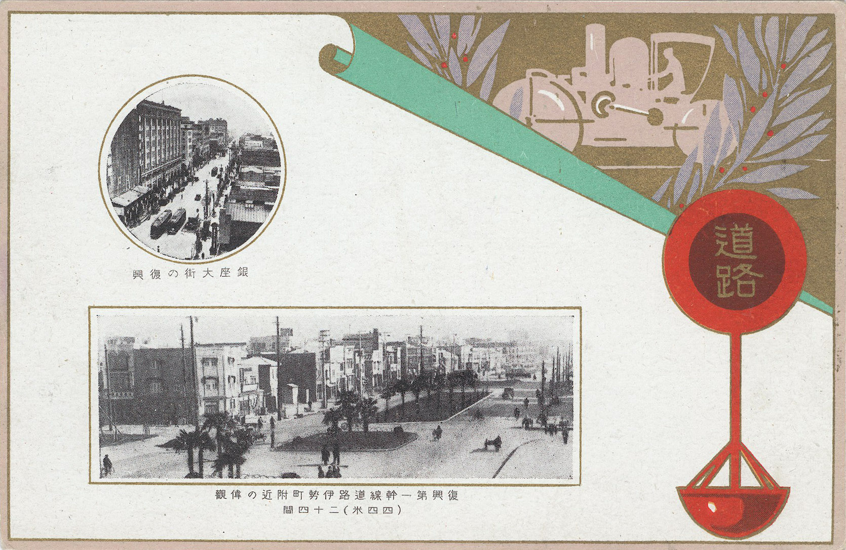 - Imperial Capital Reconstruction Commemoration, c. 1930. Road reconstruction included the creation of wide boulevards to act as firebreaks. Ginza Owari is seen in the circular inset; below, the first of the completed firebreaks, in the old Tokyo neighborhood of Ise-cho.