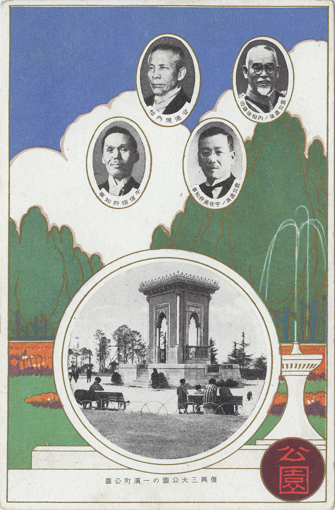 - Imperial Capital Reconstruction Commemoration, c. 1930. The Parks Reconstruction Committee. Before the 1923 earthquake, parks land comprised just 1.7 per cent of Tokyo’s urban space. By 1930, that area had more than doubled to 3.7 per cent. Seen here is Hamacho Park, in Nihonbashi Ward.
