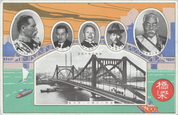 - Imperial Capital Reconstruction Commemoration, c. 1930. The Bridges Reconstruction Committee is pictured above Kiyosu-bashi, erected in 1928 across the Sumida River, one of Tokyo’s 97 new or rebuilt main spans to replace those destroyed by the Great Kanto Earthquake.