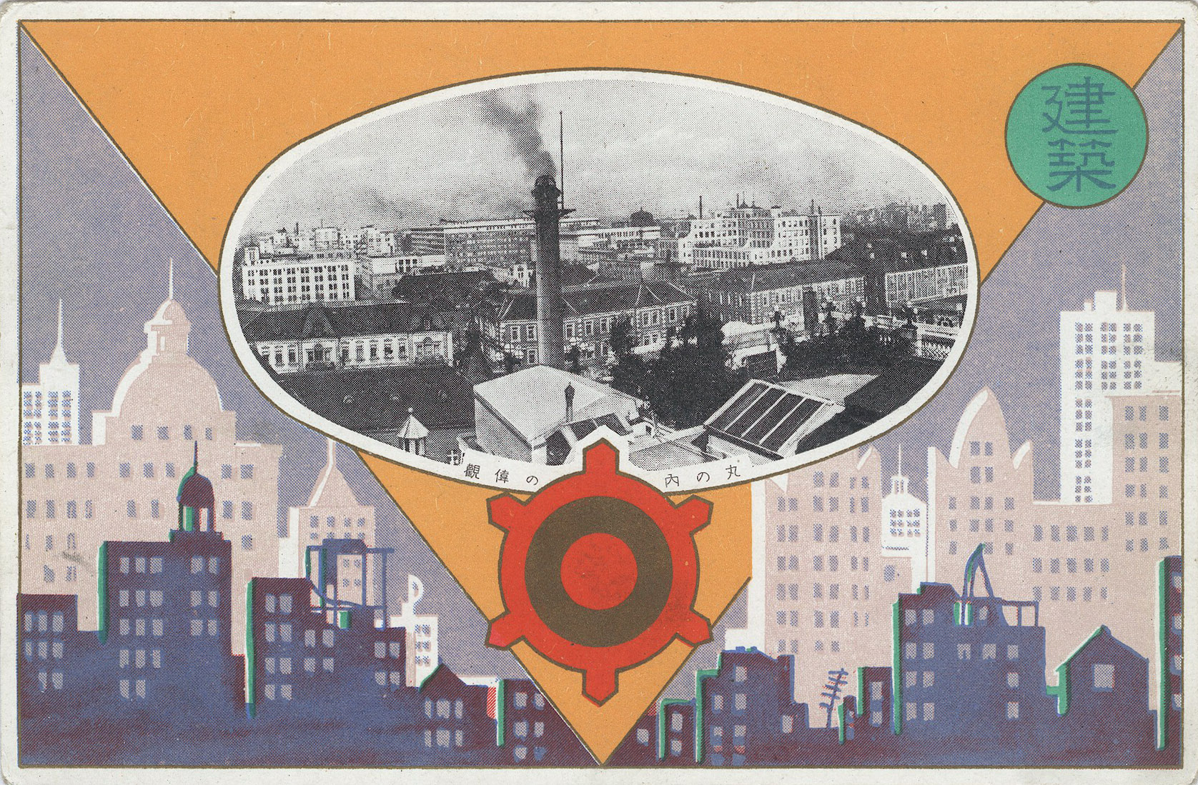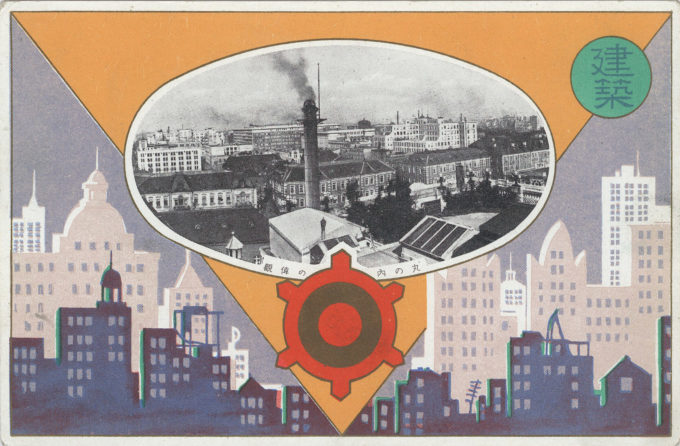 Imperial Capital Reconstruction Commemoration, c. 1930. An elevated view of the Marunouchi business district, looking north toward Marunouchi Londontown, Tokyo Central Station and the Marunouchi Building.