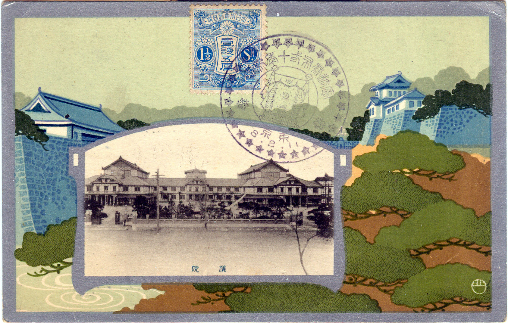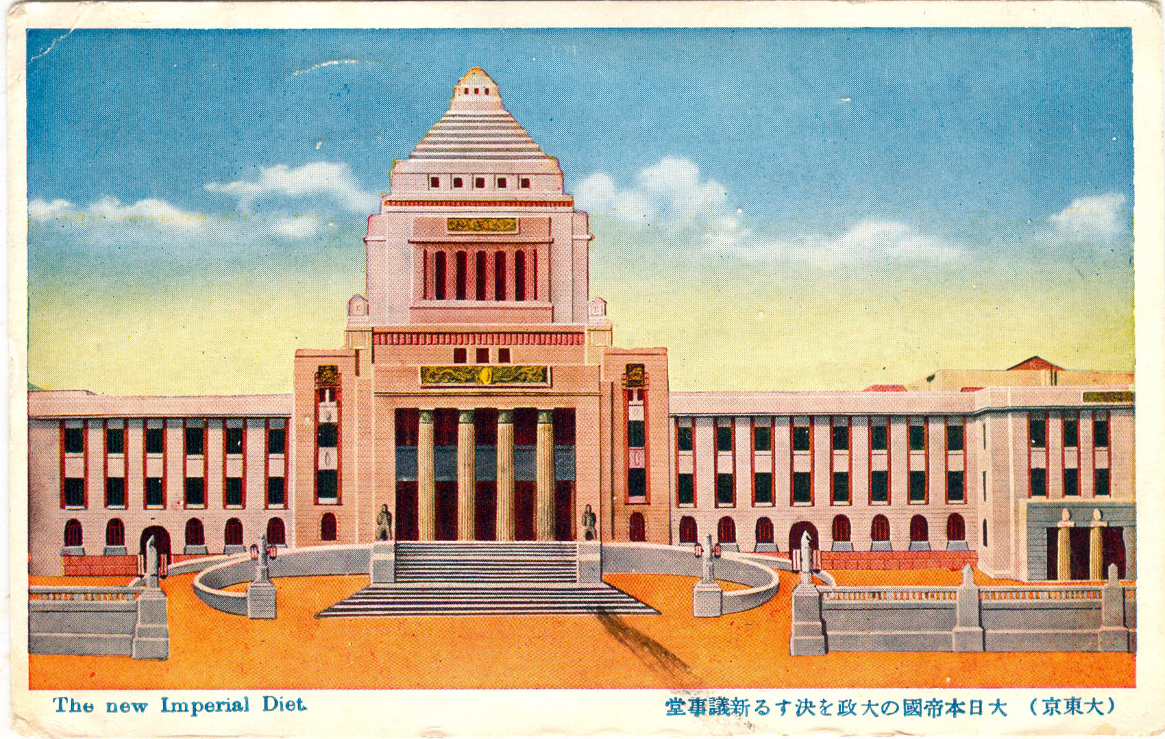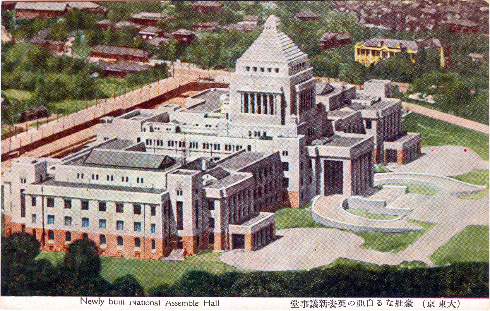 “The present-day Diet Building was eventually constructed between 1920 to 1936 across from the Imperial Palace with a floor plan based on Fukuzo’s entry. The roof and tower of the building might have been inspired by another entrant, third prize winner Takeuchi Shinshichi, and are believed to have been chosen because they reflected a more modern hybrid architecture than the purely European and East Asian designs proposed by other architects.