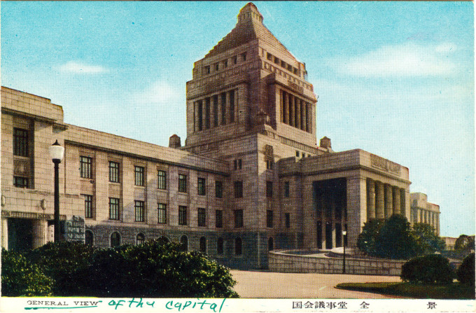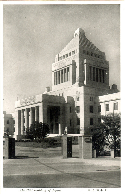 “The Diet Building stands majestic and imposing in Nagata-cho, the White Hall St. of Tokyo, and its stepped white tower is seen from most parts of the city. The building is in a modified Renaissance style, with its exterior finished with white granite. Its front entrance measures 681 ft. from end to end and it is 292 ft. high. There are 393 rooms in the structure and the auditoriums of the Upper and Lower Houses are provided with 635 seats each, while the gallery has 770 seats for the Upper and 922 seats for the Lower House.