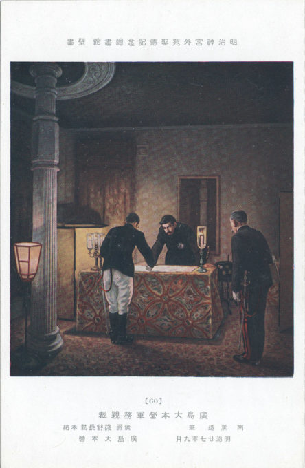 “The Emperor at Imperial Headquarters”, Hiroshima, during the Sino-Japanese War (1894-95). Displayed at the Meiji Memorial Picture Gallery, Tokyo.