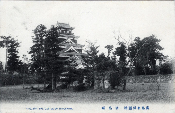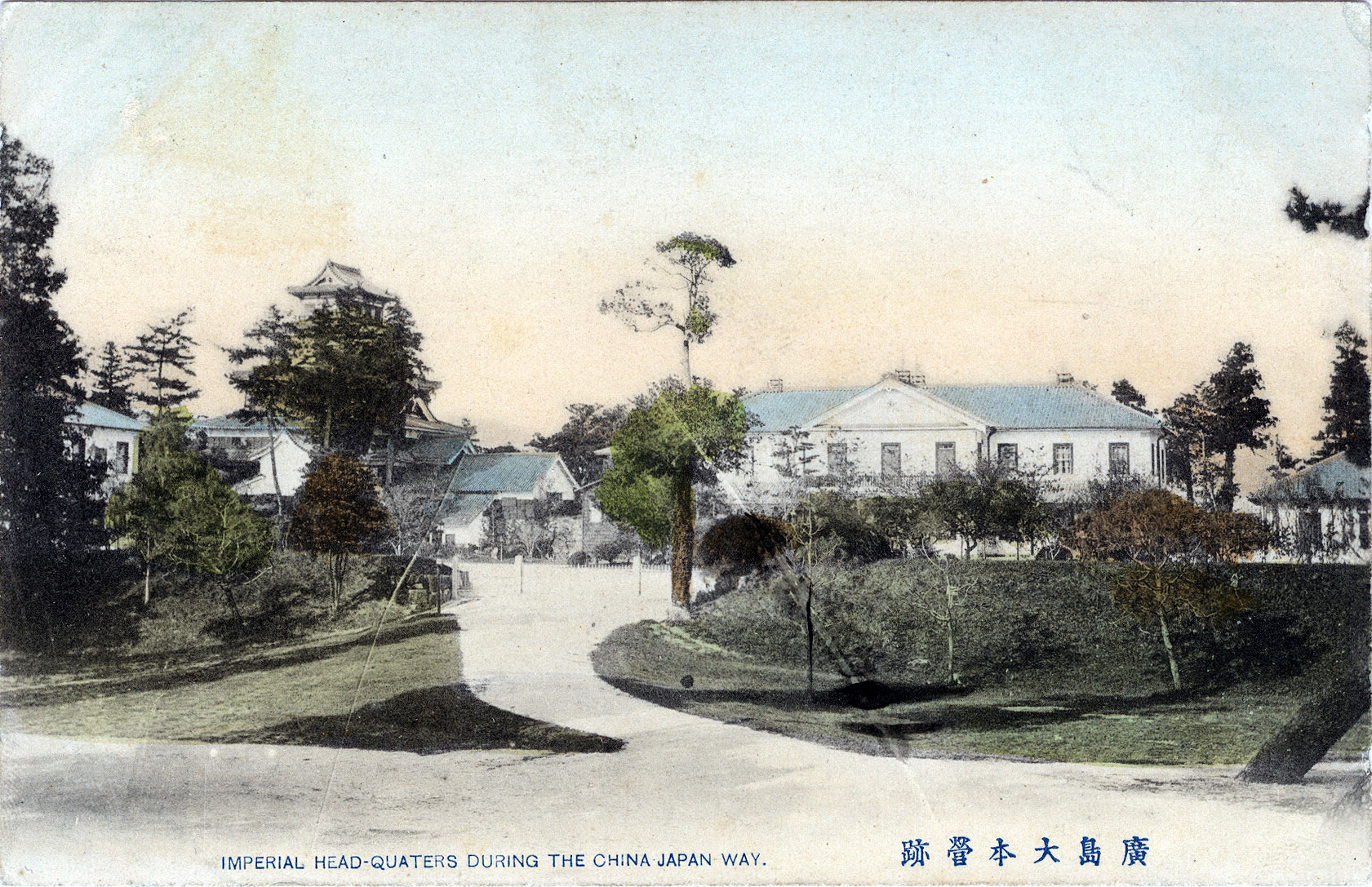 “Imperial Head-Quarters during the China-Japan War”, Hiroshima, c. 1910. During the First Sino-Japanese War (1894-1895), the Imperial General Staff headquarters were established within the grounds of Hiroshima Castle, the tower of which can be seen among the trees at left, and which also served as the temporary “palace” of Emperor Meiji during his seven-month residency.