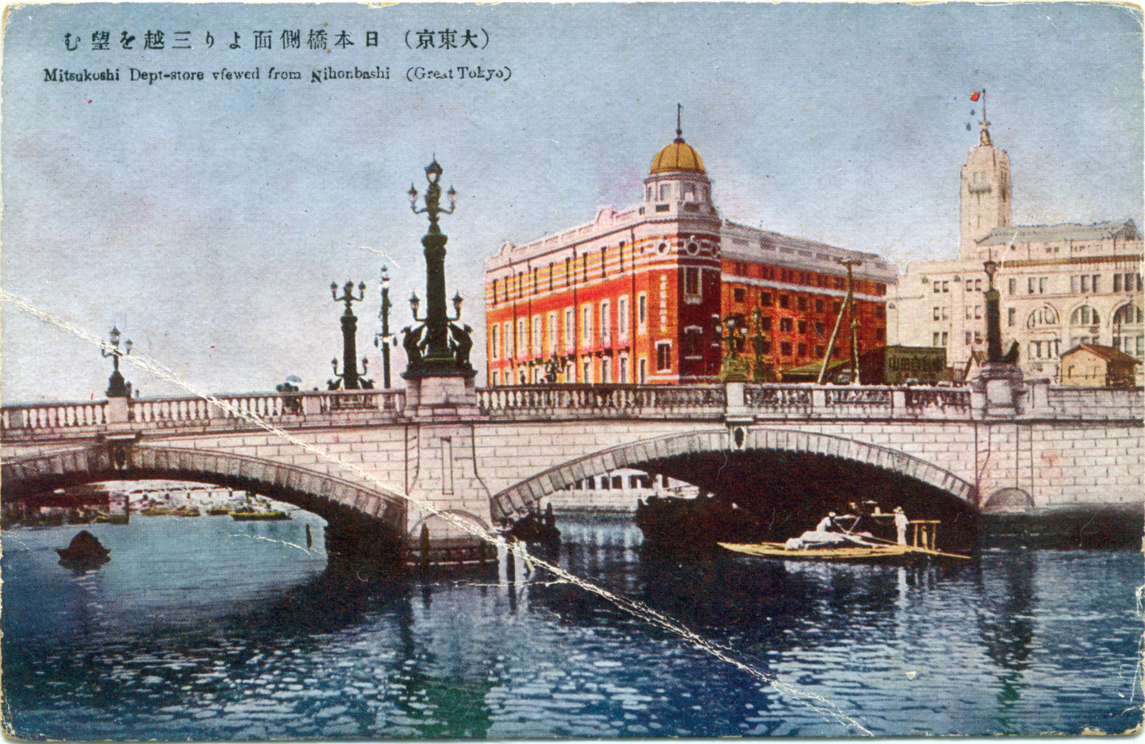 Nihonbashi Bridge (foreground), the Imperial Hemp building, and Mitsukoshi department store (right), c. 1930.