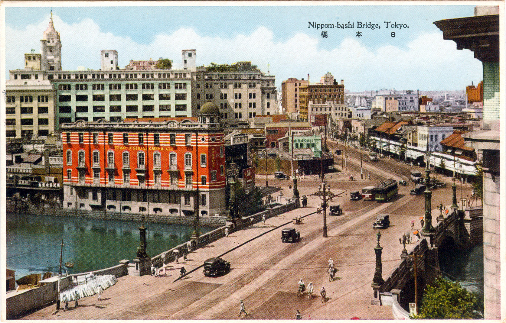The red-brick Imperial Hemp Weaving Co. Building [Teikoku Seimai Kaisha], designed by Tatsuno Kingo, astride Nihonbashi Bridge, c. 1930. Behind it is Mitsukoshi department store. The Imperial Hemp Weaving Co. was incorporated in 1907, the result of the merging of four companies that manufactured linens and hemp products.