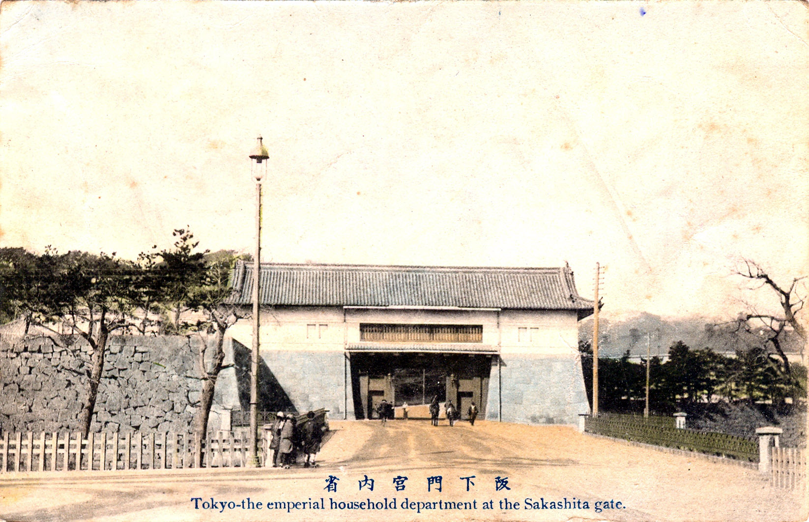 Imperial Household Department (center) at Sakashita Gate, c. 1910. The Ministry of the Imperial Household was first a division of the 8th-century Japanese government of the Imperial Court in Kyoto, formalized during the Heian period. The Department was reorganized in the Meiji period and existed until 1947, before being replaced by the Imperial Household Agency. The Imperial Household Minister, as the chief official was then called, was responsible for assisting the Emperor in all matters concerning the Imperial House.