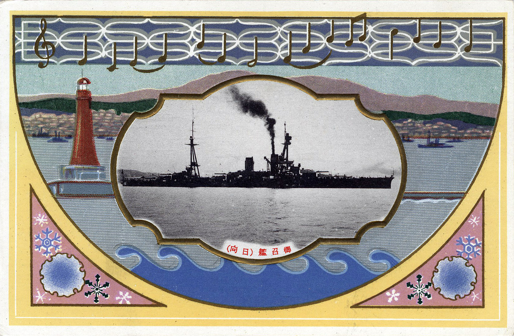 Imperial Japanese Navy battleship Hyuga, c. 1920. Laid down in 1915 at the Mitsubishi dockyard at Nagasaki, Hyuga was completed and commissioned in 1918. Considered obsolete at the start of the Pacific War, despite extensive reconstruction in the 1930s, Hyuga and its sister ship, Ise, never saw combat as battleships and were converted from 1942-43 into hybrid aircraft carriers.