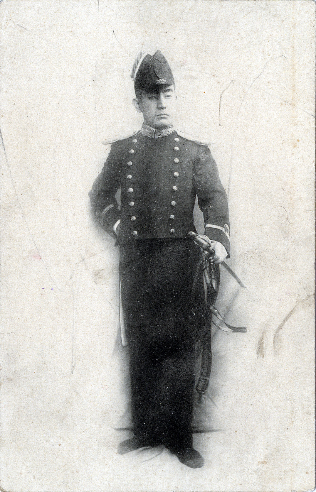 Imperial Japanese Navy officer’s dress uniform, c. 1905. This officer is holding a sword and scabbard with a colored tassel indicating his rank. Until 1872, there were no regulation naval swords and officers regularly carried a traditional katana tucked into their leather service belt. The first true Imperial Japanese naval sword was a copy of the British naval saber, issued to officers and marine NCOs, with deck officers and flag officers boasting more elaborate versions including gilded brass mounts.