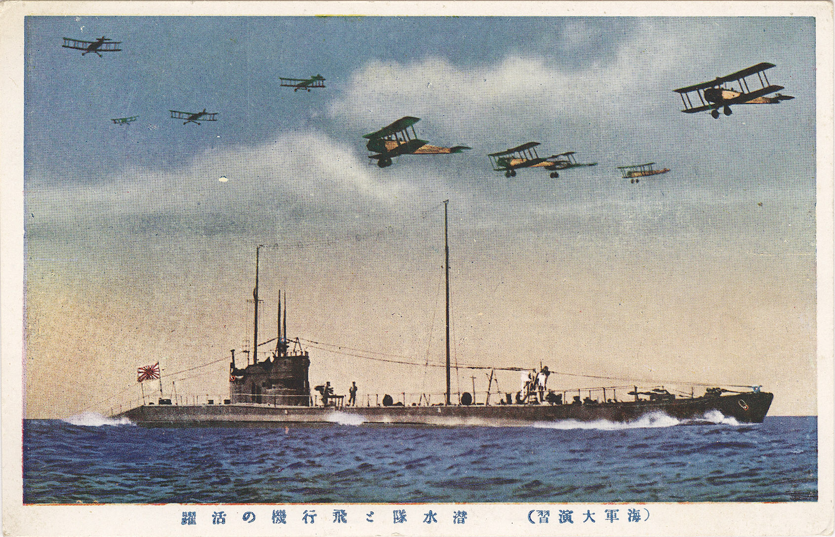 Imperial Japanese Navy Ro-29 class commerce raider submarine, c. 1930, being overflown by Imperial Japanese Navy carrier-based Mitsubishi 2MR4 reconnaissance fighter planes.