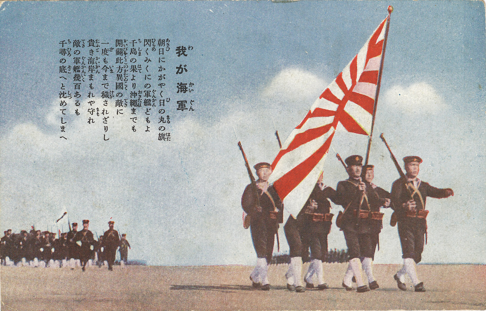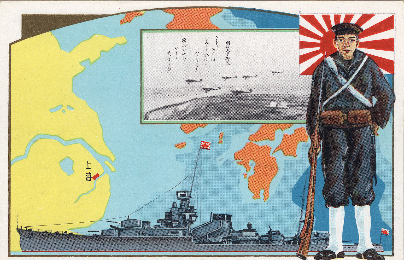 Imperial Japanese Navy Shanghai Naval Landing Force (SNLF) Marine propaganda postcard, 1932., pictured over a map depicting the location of Shanghai (上海, Shiyanhai), China, and a Yubari-class light cruiser. Assigned to the Yokosuka Naval District, Yubari was ordered to Shanghai, China, on January 26, 1932, after the staged rioting had begun that prefaced the First Shanghai Incident, carrying the Shanghai Naval Landing Force (later renamed ‘Special Naval Landing Force’) past Chinese forts at the mouth of the Whangpoo River in an end-run around Chinese troops. Yubari would also be active at the start of the Second Sino-Japanese War in August 1937 to assist in the evacuation of Japanese civilians from coastal cities in southern China. The Yubari was originally laid down in 1923 as an experimental cruiser, and presented a radical departure in appearance from previous designs with her clipper bow and combined, swept-back main funnel that would mark the beginning of the “modern” period of Japanese naval design.