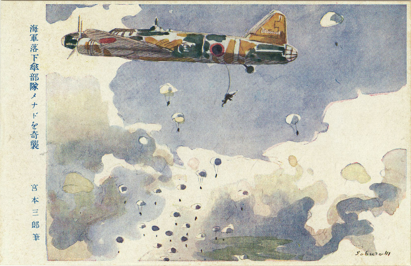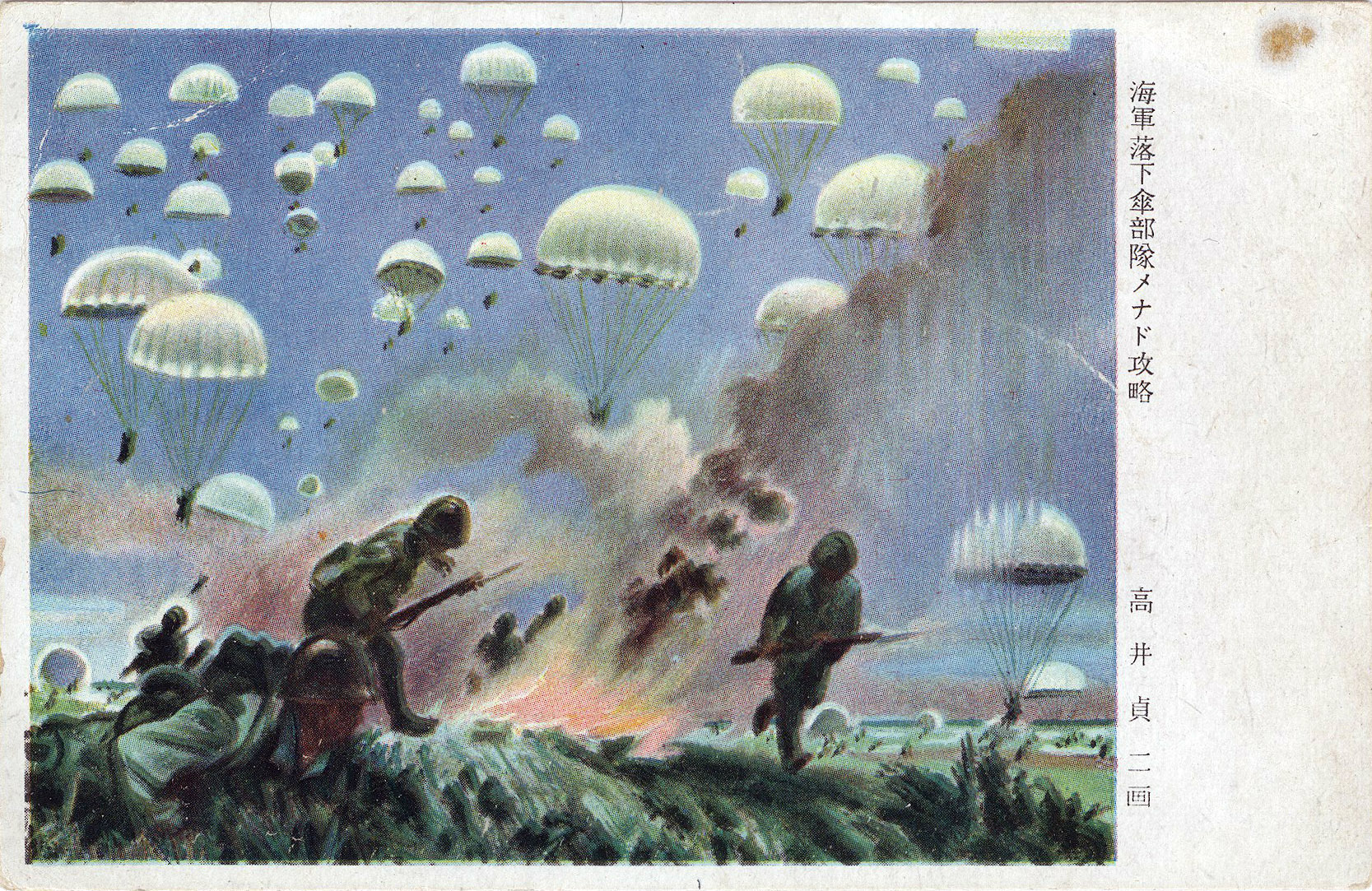 “Imperial marine paratroopers at the Battle of Manado”, propaganda postcard, 1942, Japan’s first ever combat air drop. The lightly armed parachute units of the 1st Yokosuka Special Naval Landing Force were airlifted by Mitsubishi G4M bomber-transports, with the target objective of capturing Langoan airfield, south of Menado City, and the Kakas seaplane base.
