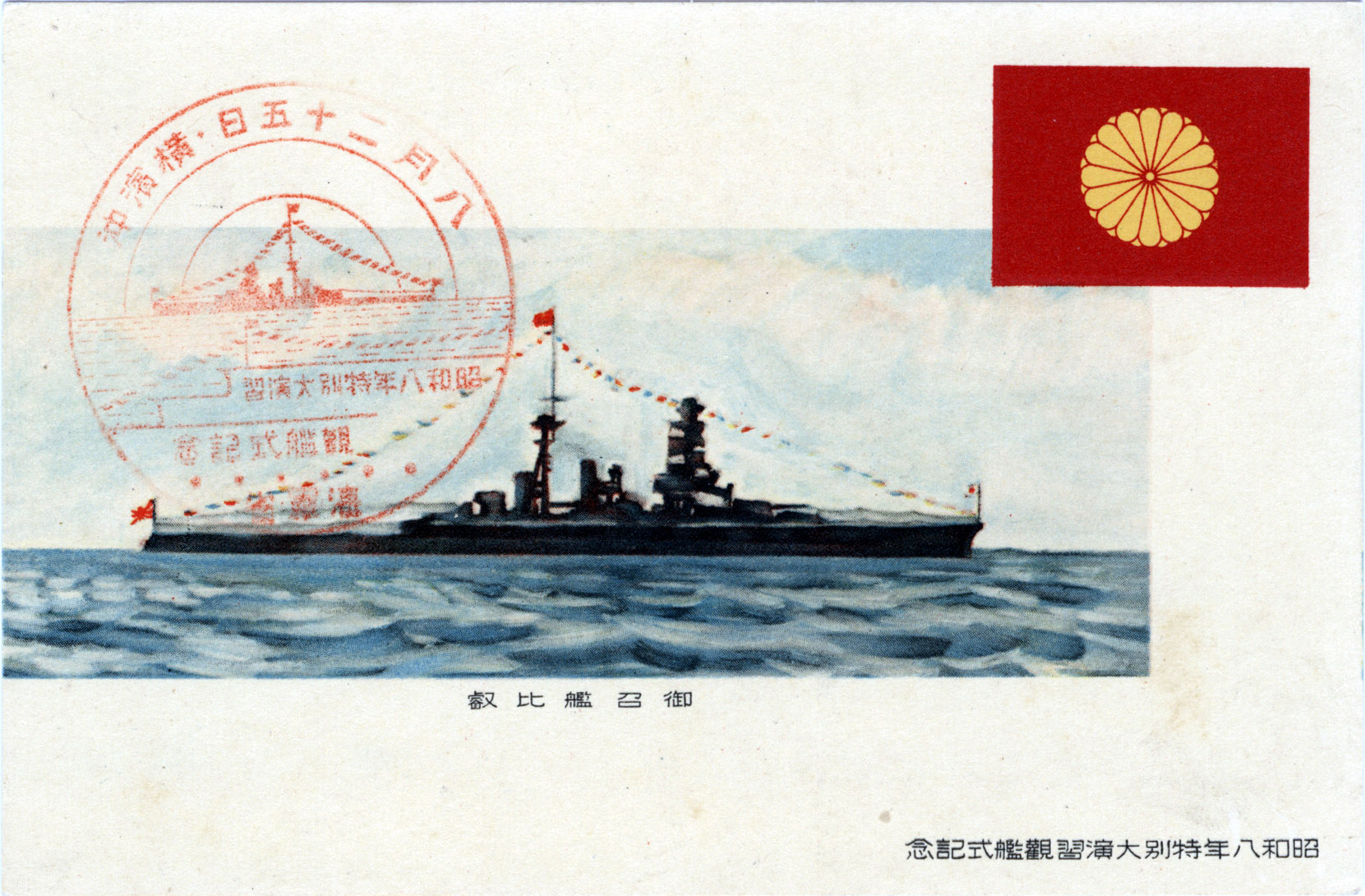 Battlecruiser Hiei, as it appeared serving as the Emperor’s flagship during the 1933 Imperial Navy Review in Tokyo Bay, August 25-26. The Imperial Standard, the 16-petal golden chrysanthemum crest, is pictured at upper-right. In this image, Hiei is missing an aft turret and its 6-inch guns, removed under terms of the 1922 Washington Naval Treaty but restored in 1937.