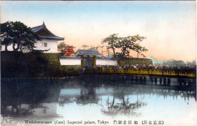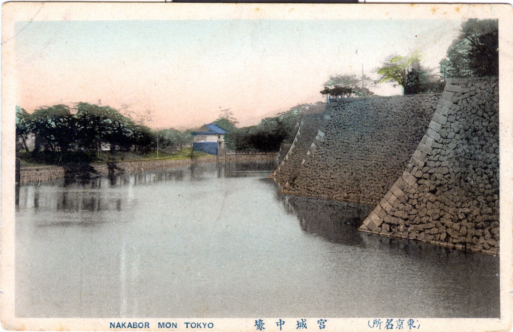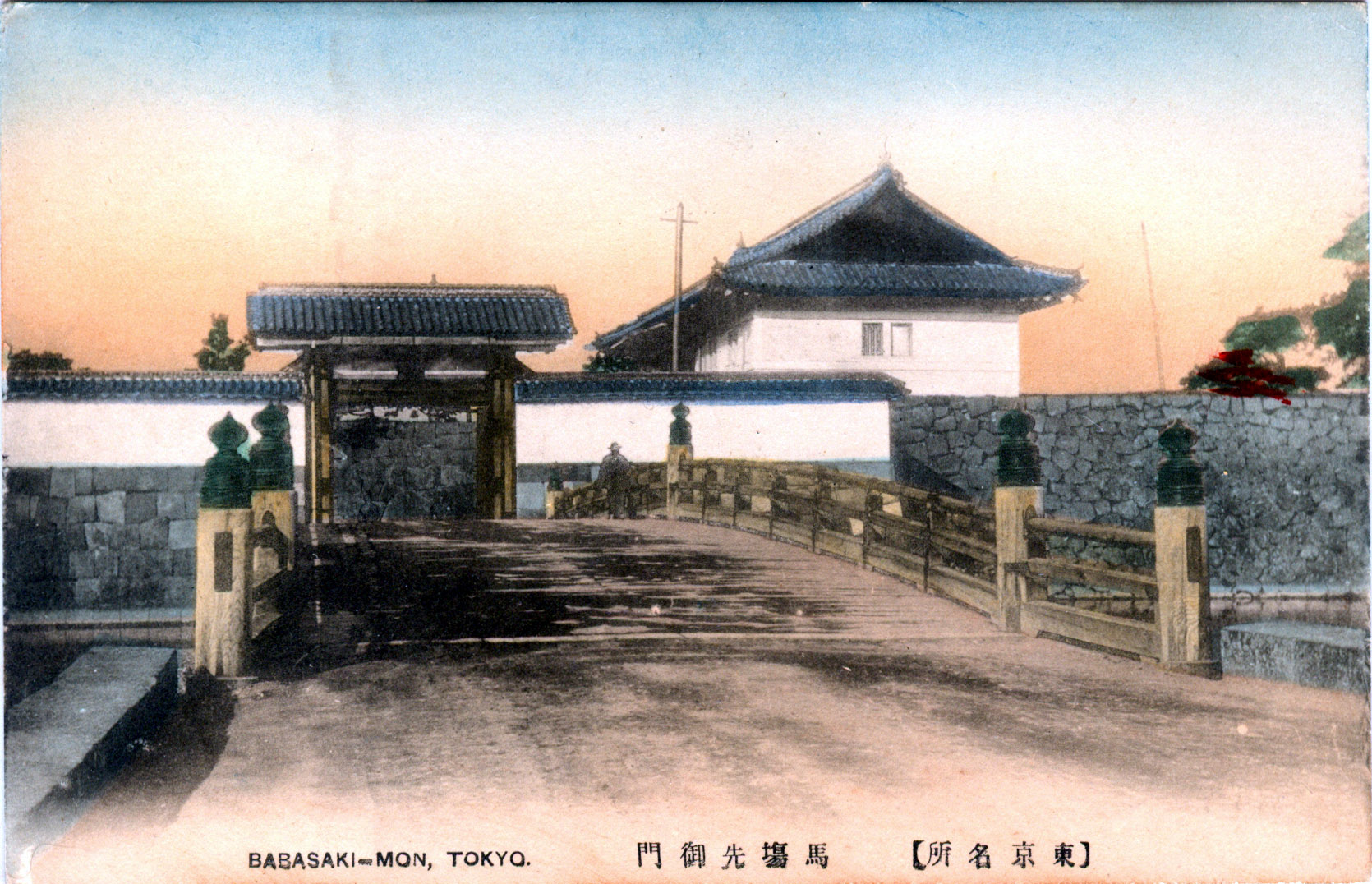 “Visitors usually enter the through the Sakashitamon farther along toward the north. The Babasakimon which prior to the Russo-Japan War spanned the outer moat about 1-mile to the east of Seimon was razed because it was too small to admit of a throng at one time; its demolition was hastened by a fatal crush which occurred during a demonstration at the close of the war in 1905.