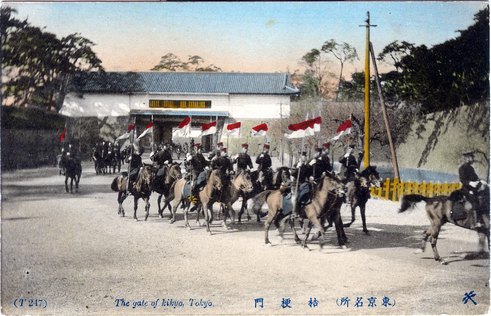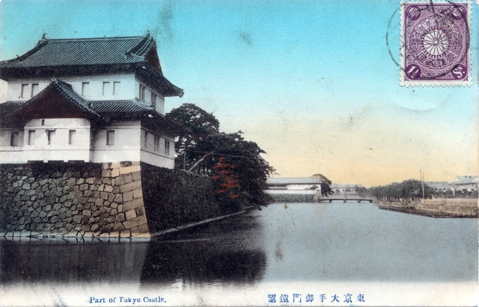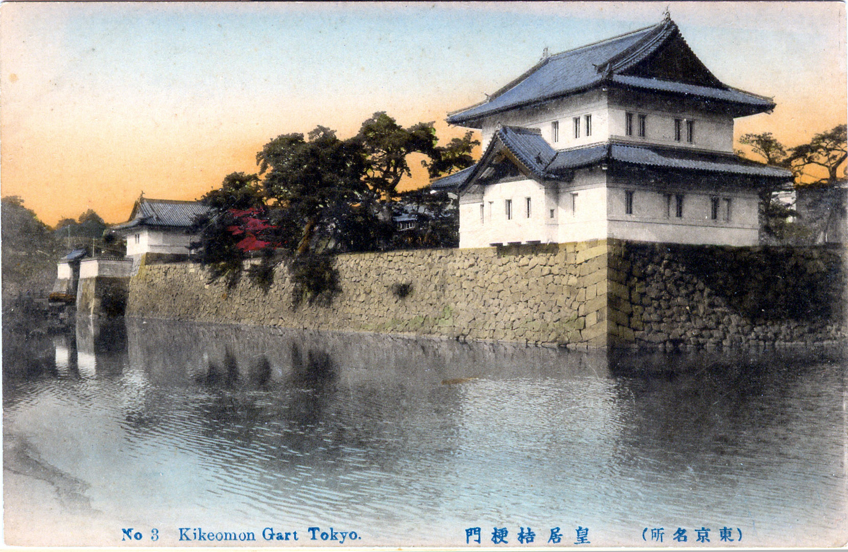 “Visitors usually enter the through the Sakashitamon farther along toward the north. The Babasakimon which prior to the Russo-Japan War spanned the outer moat about 1-mile to the east of Seimon was razed because it was too small to admit of a throng at one time; its demolition was hastened by a fatal crush which occurred during a demonstration at the close of the war in 1905.