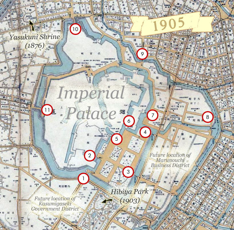 1. Sakurada-mon: The ceremonial entrance to the palace grounds; 2. Sei-mon: The main entrance to Edo Castle; 3. Babasaki-mon: Razed in 1905; 4. Wadakura-mon: Razed in 1905; 5. Sakashita-mon: The present-day entrance to the Imperial Household and palace; 6. Kikyo-mon: Also known as the Inner Sakurada gate, through which minor officials and tradesmen accessed the castle. 7. Ote-mon: Provided access to the inner castle from the daimyo district. 8. Tokiwabashi: Connected the mint to the castle and palace grounds; 9. Nakabori-mon: Gate through which the Shogun’s retainers entered the castle grounds. 10. Tayasu-mon: North gate, and access to Yasukuni Shrine. 11. Hanzo-mon: West gate entrance from Akasaka and the Akasaka Detached Palace.