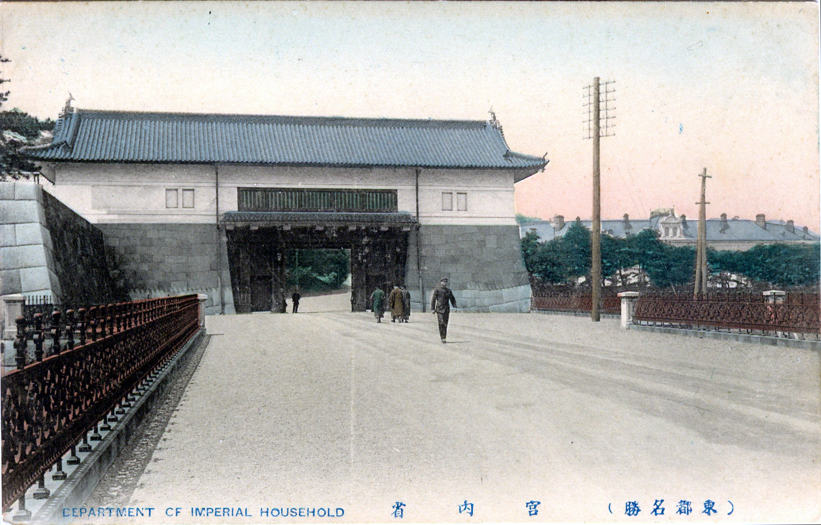 “The Palace and its appurtenances are under the jurisdiction of the Imperial Household Department, and travelers with requests to make of the latter must first apply to their minister or ambassador, who in turn will perhaps refer them to the Foreign Office. If one’s credentials are strong enough, one is provided with a letter to the proper official in the department, and a small, stamped, ideographic wood ticket (mokan) which must be shown to the guard (admittance is refused without it, and tips are useless) at the iron-studded Sakashitamon (gate) about 1/4-mile north of the Main Gate at Nijubashi. The ticket must be retained and shown on leaving; then returned to whomsoever has supplied it.”