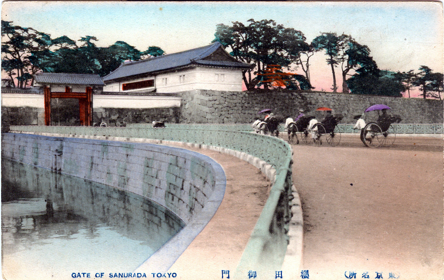 “The Sakuradamon (cherry village gate) at the south of the palace grounds, with its big penthouse and massive iron fitments, is associated in the native mind with the assassination Ii Kamon no Kami, the last of the Tokugawa Premiers, in 1865. Both the gates the inner and outer one are known by the same name. The corresponding gate at the northeast corner of the inclosure is called Wadakuramon.”