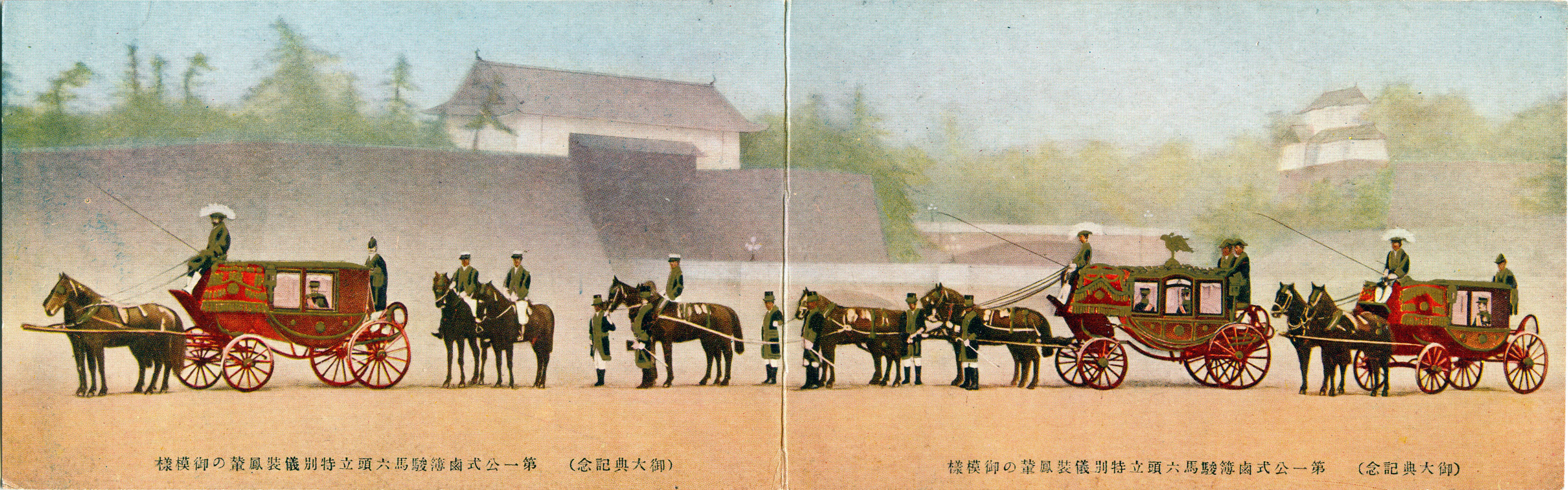 HIM’s royal carriage on the palace plaza in front of the Seimon gate and Nijubashi, c. 1910. In the distance, at right, is the Fushimi tower.