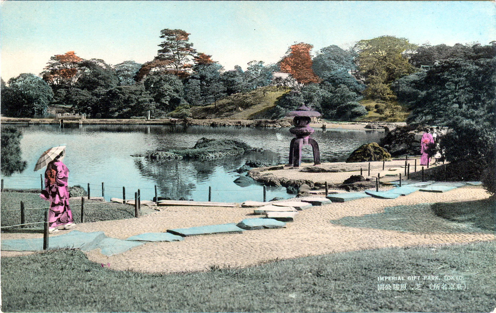 “… Many beautiful gardens were created in the castle compound where the Shogun lived, and some of these are still preserved. The garden of Hama detached palace in Tokyo was so laid out that the salt water [of Tokyo Bay] was led into its big lake and the view of Fuji San beyond the Bay of Shinagawa could be enjoyed.”