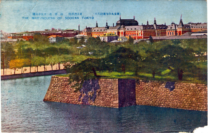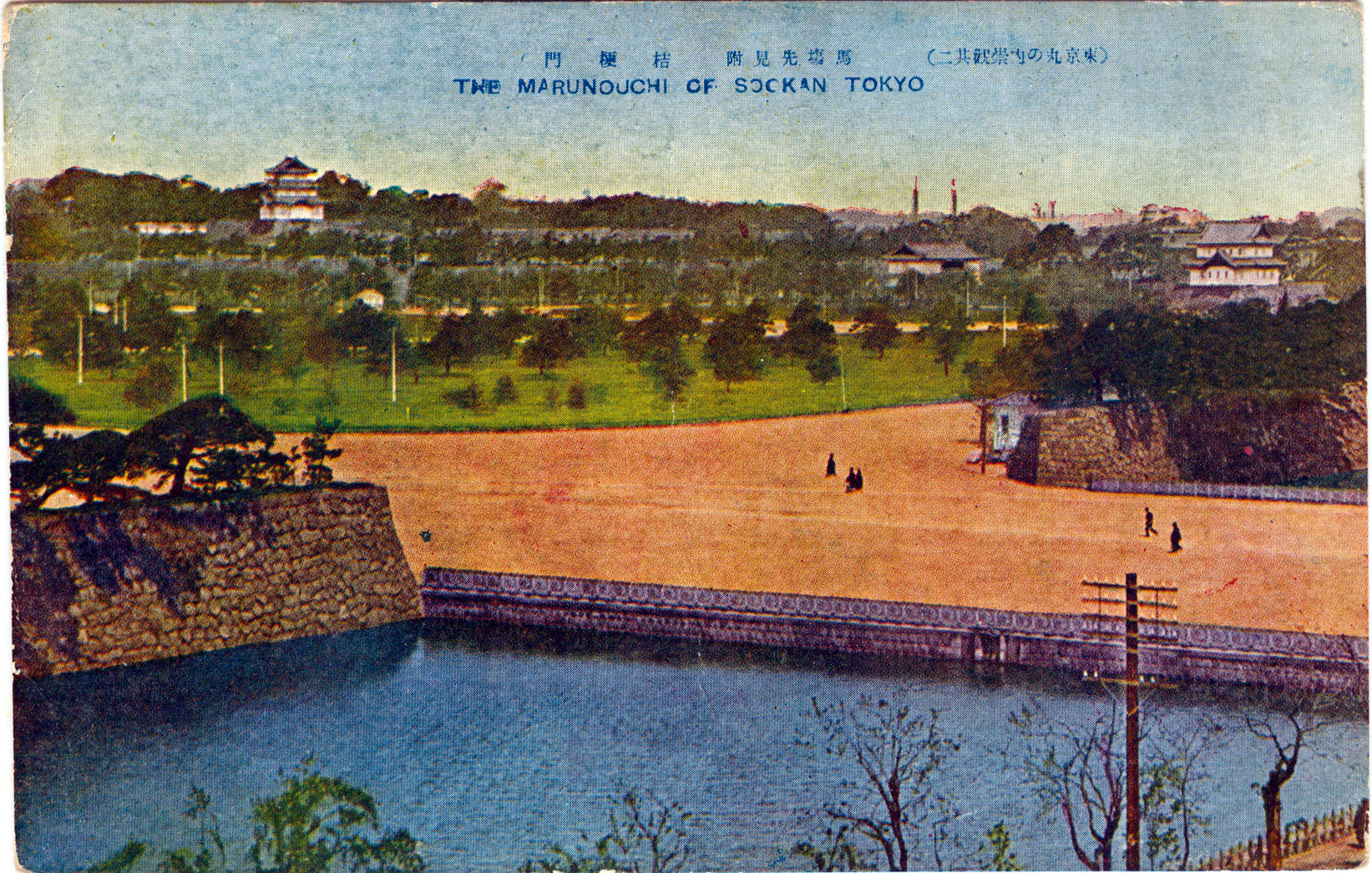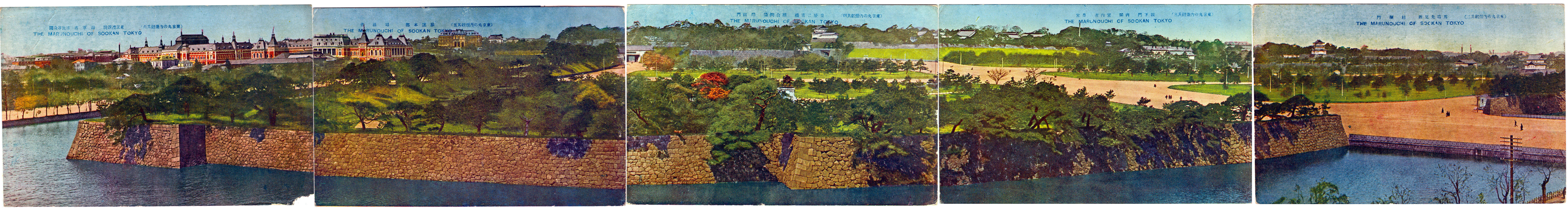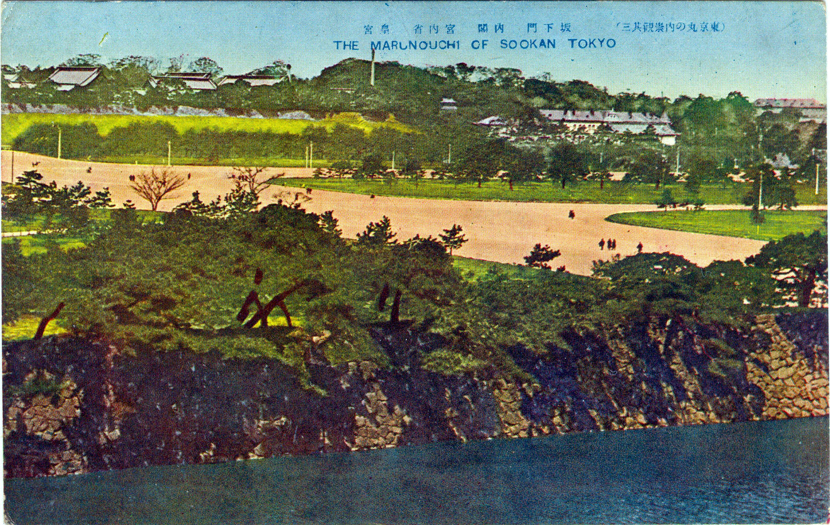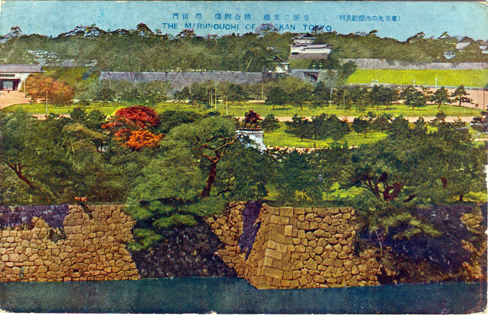 Panoramic view of the Imperial Palace, c. 1920. At center are Nijubashi, Fushimi Tower and the bronze monument dedicated to Nanko (Masashige Kusunoki); at left, government ministries in the Kasumigaseki district; at right, the palace plaza and, beyond, the Imperial Household Ministry.