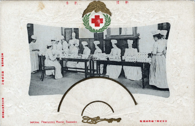 “Some of the many Associations existing in Japan for the care of the sick and wounded in [the Russo-Japanese War], and the relief of the families of soldiers and sailors, in the field, which have lost their breadwinners include … the Association of Volunteer Nurses. [It] was first organized in the 20th year of Meiji (A.D. 1887) [and] draws its members from the Imperial Princesses, the Court Circle, and the wives of the nobility and gentry. [T]he present General Director and President being H.I.H. Princess Kanin and the Marchioness Nabeshima.