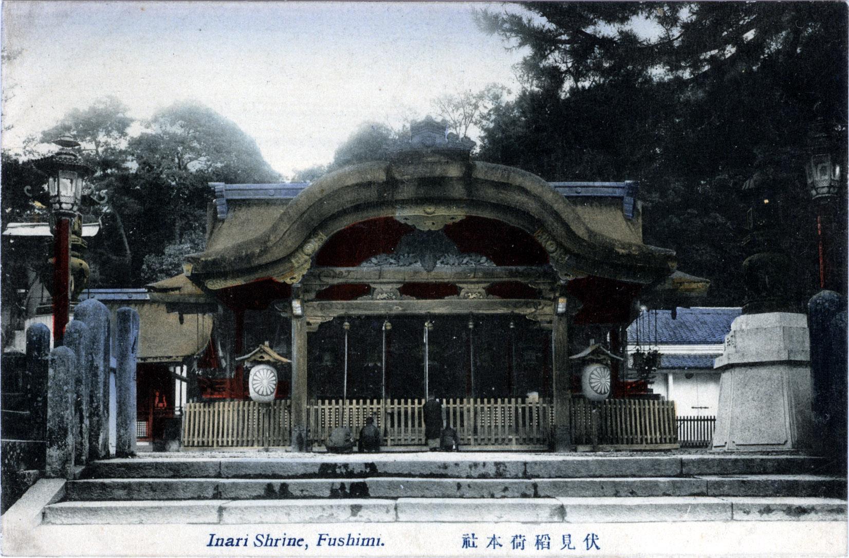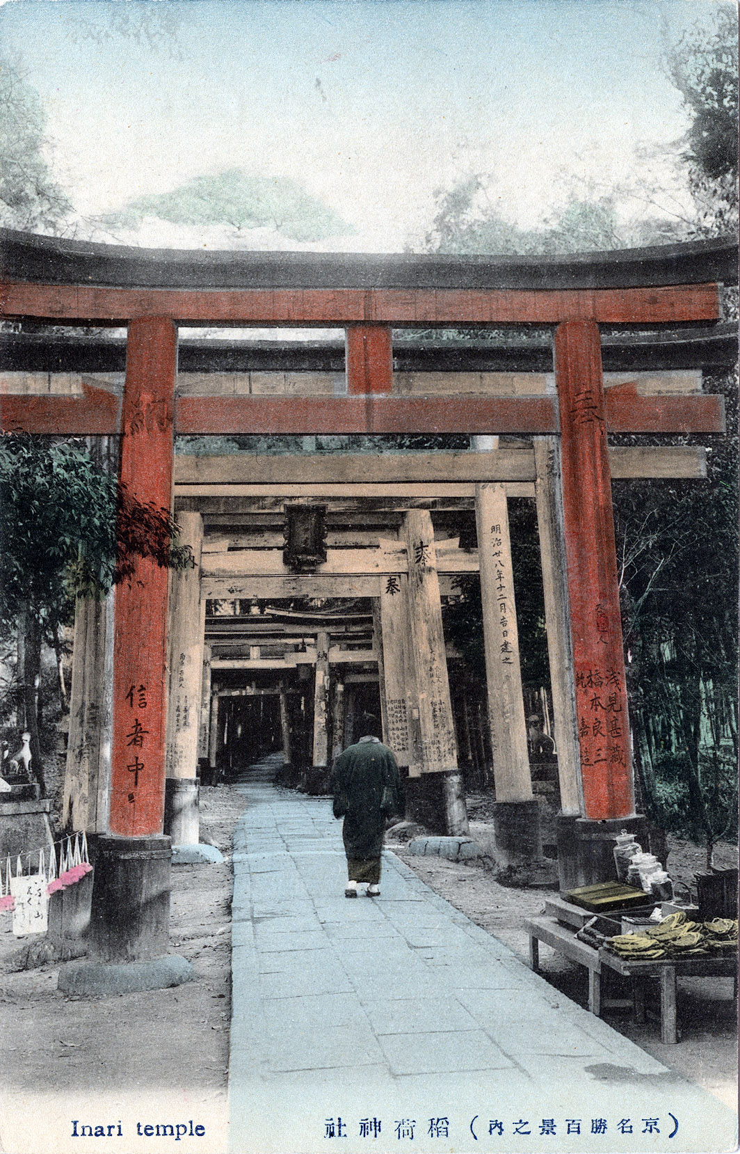 Inari Shrine, Fushimi, Kyoto, c. 1910. Fushimi Inari-taisha is the head shrine of the god Inari, located within the precincts of Kyoto, Japan. The shrine sits at the base of a Inari-yama, a mountain 760+ feet above sea level. Since Japan’s earliest beginnings, Inari was originally and remains primarily the kami of rice and agriculture, but merchants and manufacturers also worship Inari as the patron of business. The first shrine built on the site was constructed in 711 CE. The present-day main shrine structure was built in 1499. Each of the roughly one-thousand torii leading to Fushimi Inari-taisha itself was donated by a Japanese business.