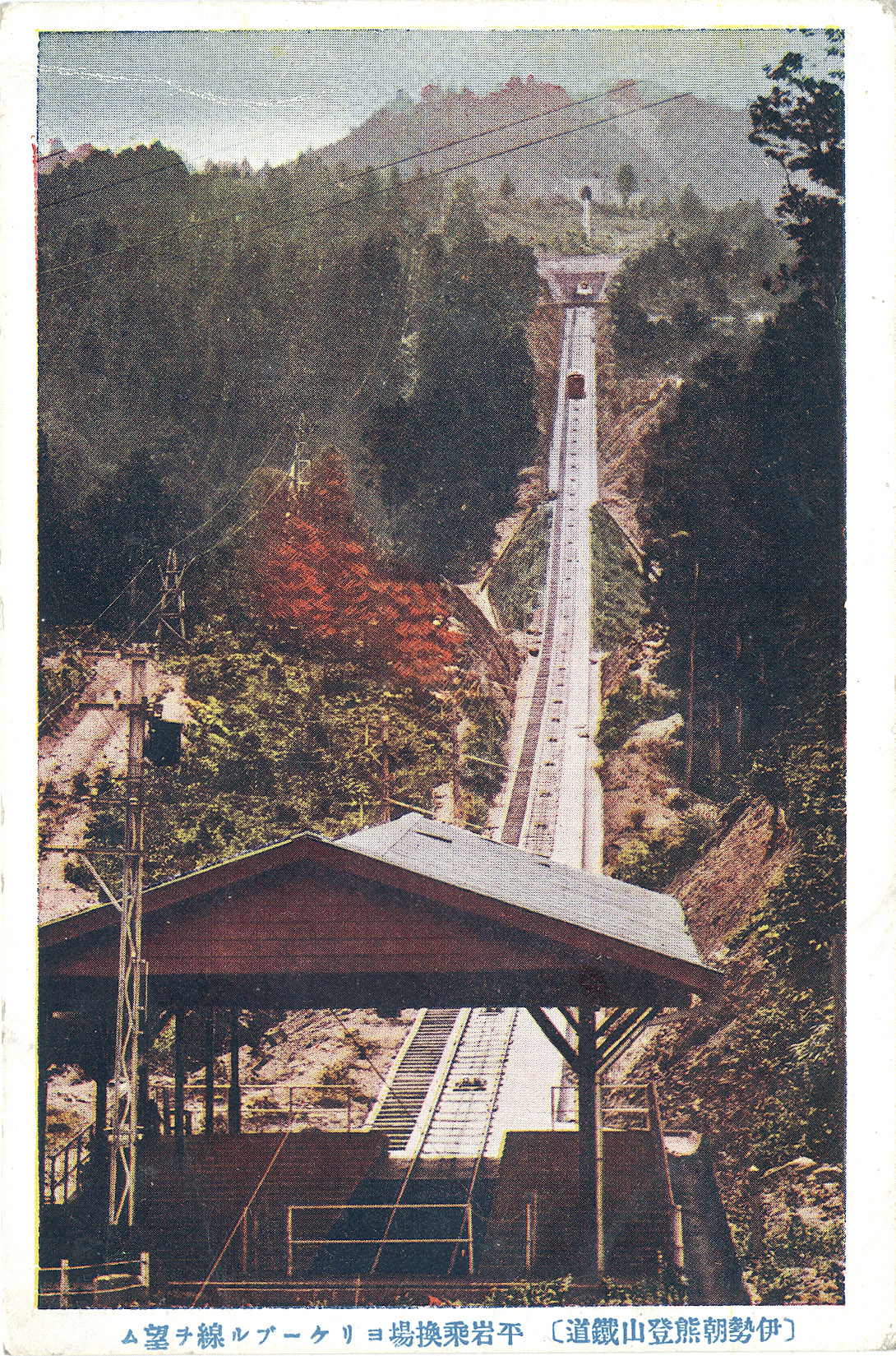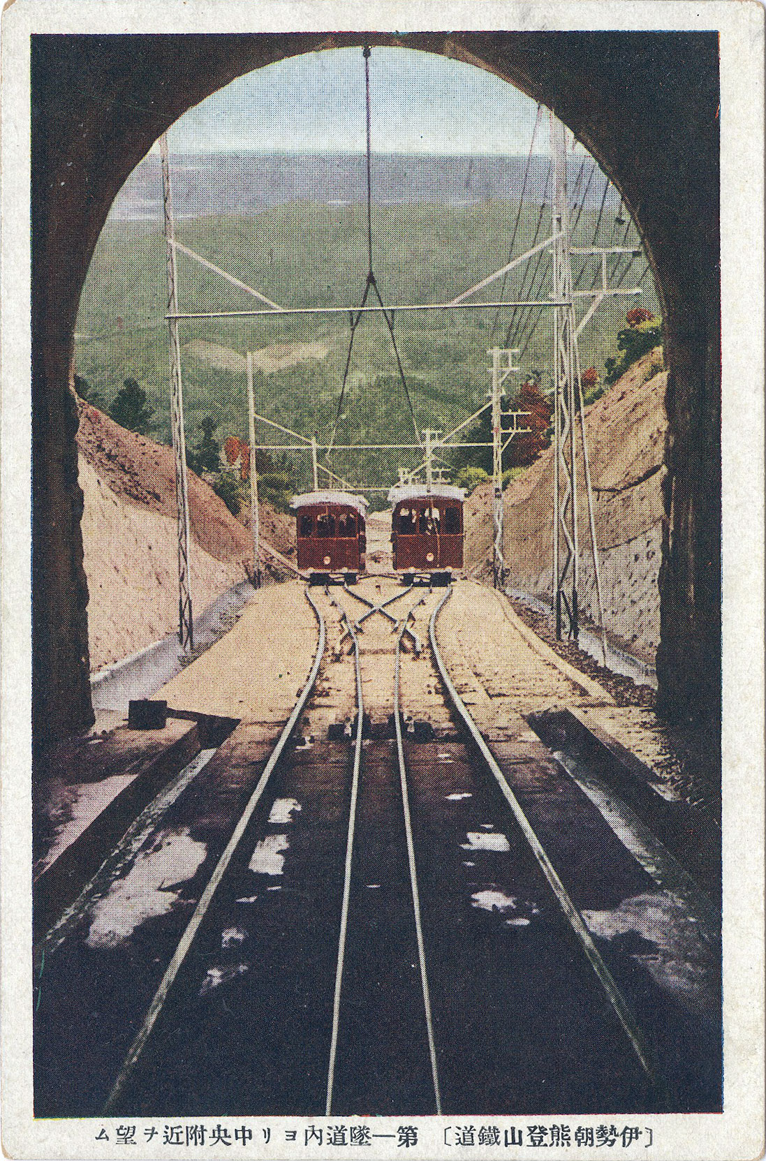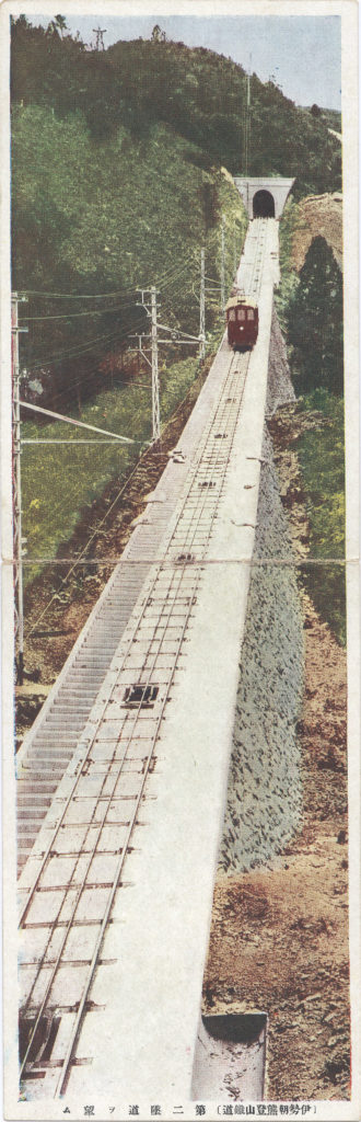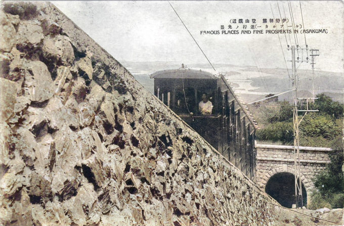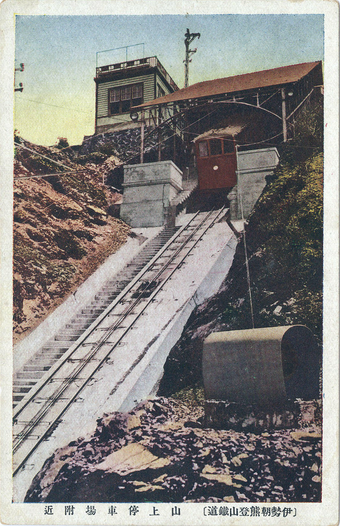 “The Asakuma Cable Car climbed a short but steep route up the mountainside. It quickly became popular with the burgeoning number of recreational tourists (vs. religious pilgrims) visitng Ise Shrine and other regional attractions.
