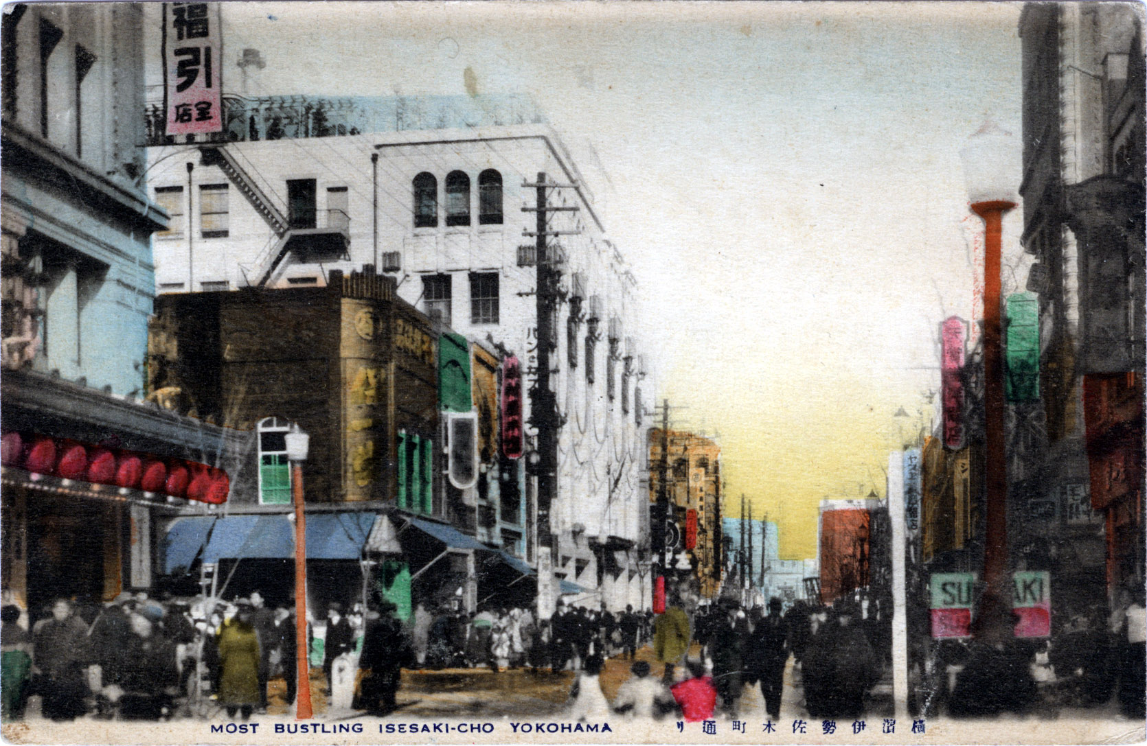 “Most bustling”, Isesaki-cho, Yokohama, c. 1930. Until the 1960s, Isezaki-cho was the only large shopping area in Yokohama catering to local, non-foreign residents.