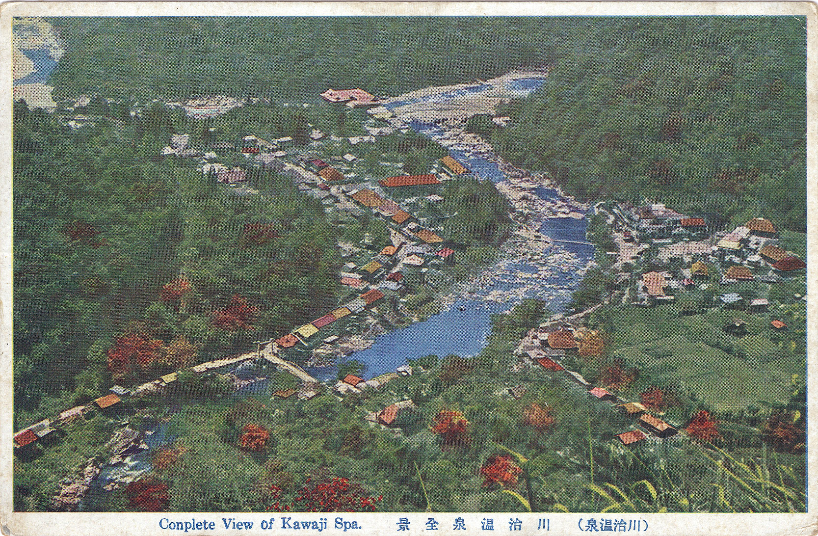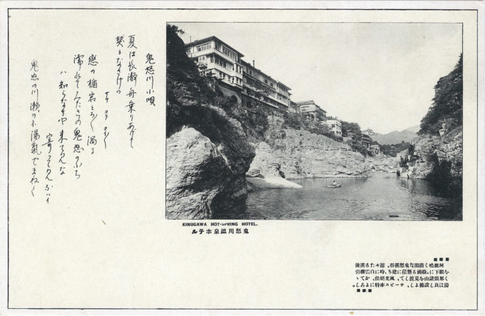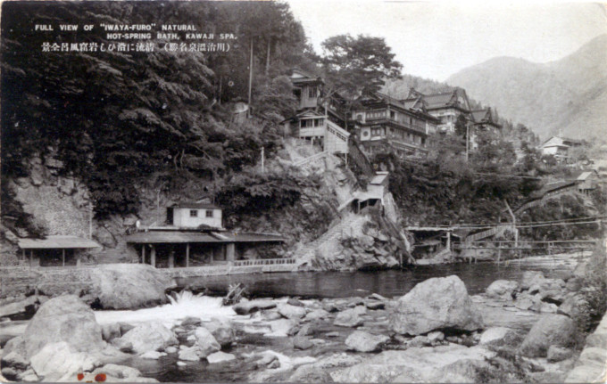 “Kawaji Onsen Hot Spring is a famous onsen [hot spring] district at Nikko near the merging of the Kinugawa and Ojikagawa rivers, with waters said to be especially healing for wounds, injuries and burns. The hot spring was accidentally discovered when the area was flooded in 1723 by Lake Ikari-ko, after a long period of rain, when a hot spring was discovered gushing up from the riverbed after the floodwaters subsided.