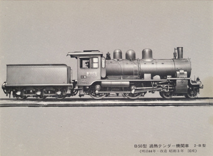 The Class B50 were 4-4-0 American-type superheated steam locomotives operated by the Japanese Government Railways and Japan National Railways from 1928 to 1958. The locomotives were not new constructions; rather, converted from twenty-seven Class 6700 locomotives from 1928 to 1930, with the conversions taking place at JGR’s Hamamatsu, Kokura, Ōmiya and Takatori Works factories. Class B50s pulled short passenger trains, mostly located around the Nagoya and Osaka regions. In their later lives the locomotives were used for railyard shunting.