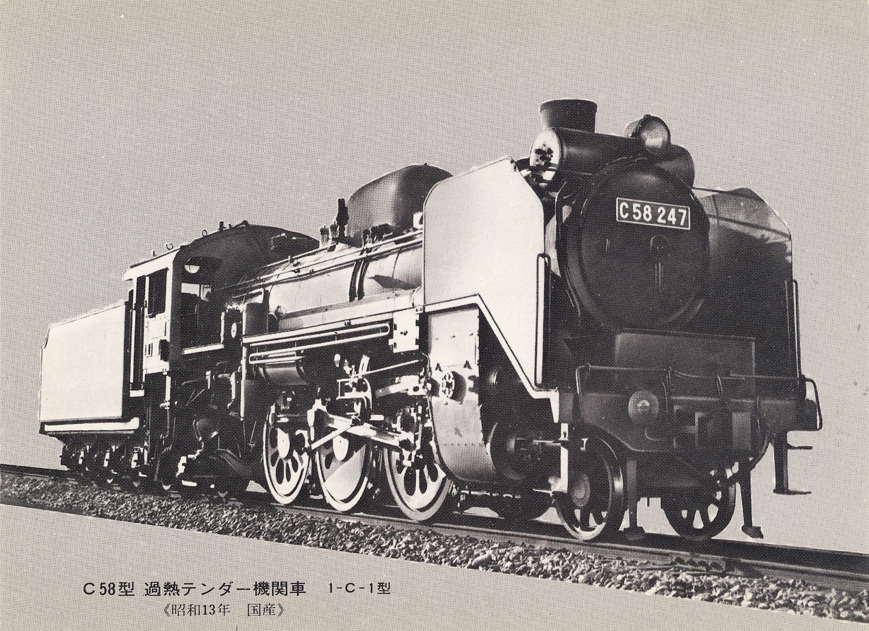 The Class C58 was a 2-6-2 Prairie-type steam locomotive built for the JGR from 1935 to 1939, designed as successor locomotives to the older Class 8620 and 9600 locomotives, combining the speed of the 8620s and the strength of the 9600s. A total of 413 Class C58 locomotives were manufactured with the last C58 in operation by JNR retiring in 1974. Forty-nine C58 locomotives have been preserved, with three remaining operational as tourist trains in Kyoto, Morioka and Kumagaya.
