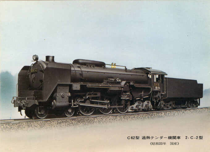 JNR Class C62. (1948-1973) The Class C62 was a type of 4-6-4 steam locomotive designed by Hideo Shima and built by the Japanese National Railways (JNR). These were the largest and fastest steam passenger locomotives to run in Japan, and hauled the Tsubame (Swallow) express on the Tōkaidō Main Line between Tokyo and Osaka. Forty-nine C62s were built from 1948 to 1949, with one remaining in service until 1973. Three examples are preserved at the Kyoto Railway Museum (with one in operational condition); two others are preserved as museum pieces, in Sapporo and Nagoya.