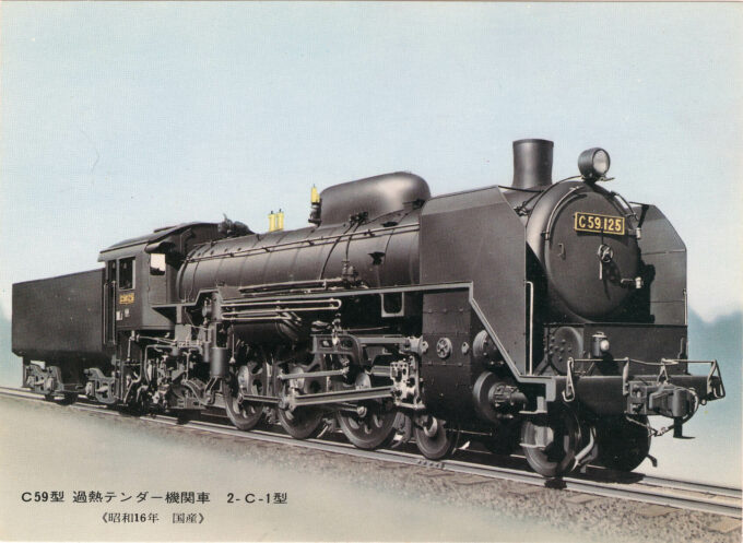 The Class C59 was a 4-6-2 Pacific-type steam locomotive built for JBR and JNR from 1941 to 1947. The C59s were used mainly as passenger locomotives and were essentially the successor locomotives to the Class C53 locomotives. A total of 173 locomotives were produced from 1941 to 1947 (with a hiatus between 1943 and 1946 due to World War II) by three manufacturers: Hitachi, Kawasaki Heavy Industries, and Kisha Seizō. Three locomotives have been preserved.