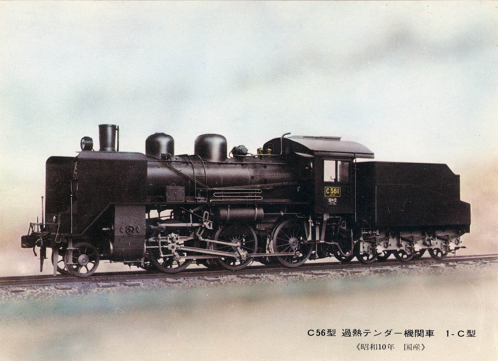 The Class C56 was a 2-6-0 Mogul-type steam locomotive built for the JNR from 1935 to 1939. The C56 was designed as a small and compact locomotive for use on small and quiet branch lines. A total of 165 locomotives were produced, including four for the Sakhalin Railwa. The locomotives were retired in 1974; some locomotives made their way to the State Railway of Thailand and saw use there. C56 160 is notable as being one of two steam locomotives which have never been retired by the JR Group although it can no longer operate on the mainline.