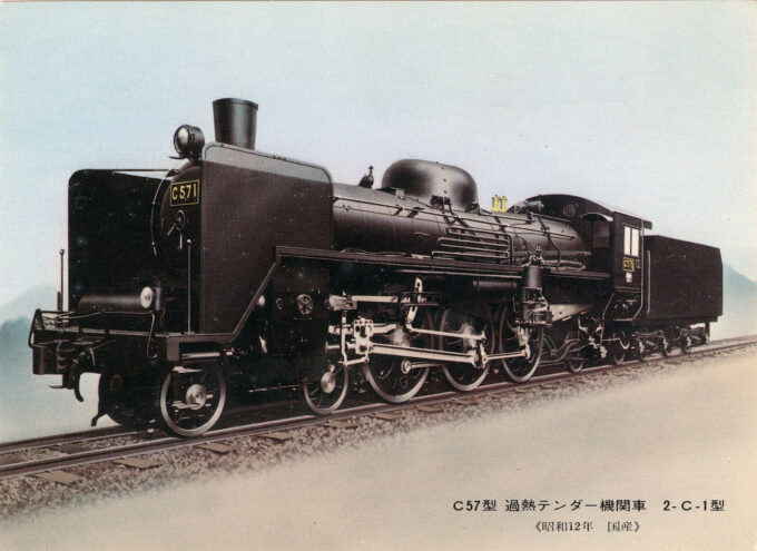 The Class C57 was a 4-6-2 Pacific-type steam locomotive built for the JNR from 1937 to 1947. The C57s were used mainly as passenger locomotives, hauling passenger services around most of the country with the exception of Shikoku; some were exported to Taiwan. The locomotives were retired in 1975. 32 C57s are preserved around Japan, with four preserved in Taiwan. The locomotives earned the nickname of “Lady” due to various reasons and is popularly known as Shigonana (C57 in Japanese) among railfans.
