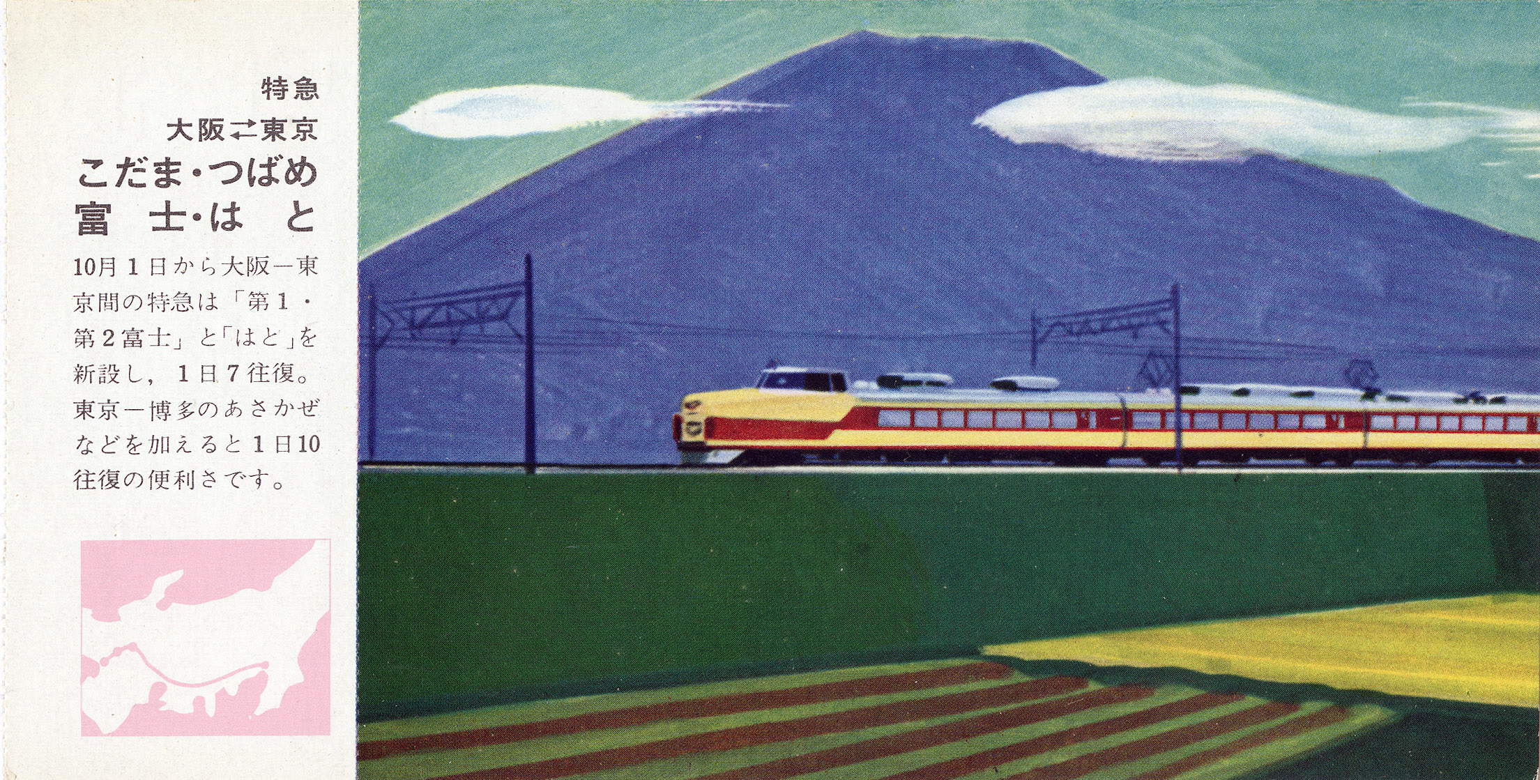 J.N.R. Tokaido Main Line Limited Express commemorative advertising postcard, 1958, announcing the introduction of “Kodama”, “Tsubame”, “Fuji” and “Hato” high-speed express service on the Tokaido Main Line between Tokyo & Osaka on October 1, 1958. After the end of the Pacific War, the national railroad began to seriously research and develop various means to increase the speeds of its railroads. The electrically-powered “Kodama” express trains did just that — reduced the travel time between Tokyo and Osaka from 12 hours to just over 6 hours between the two cities, making it possible to make a round-trip in one day, hence the name ‘Kodama’ (‘echo’). The R&D needed for the development of the 151-series trains – and the later 181-series – used for the limited express (illustrated on the postcard) would be important toward the introduction of the Shinkansen (“Bullet Train”) in 1964 after which the “Kodama” name was transferred to the faster Shinkansen.
