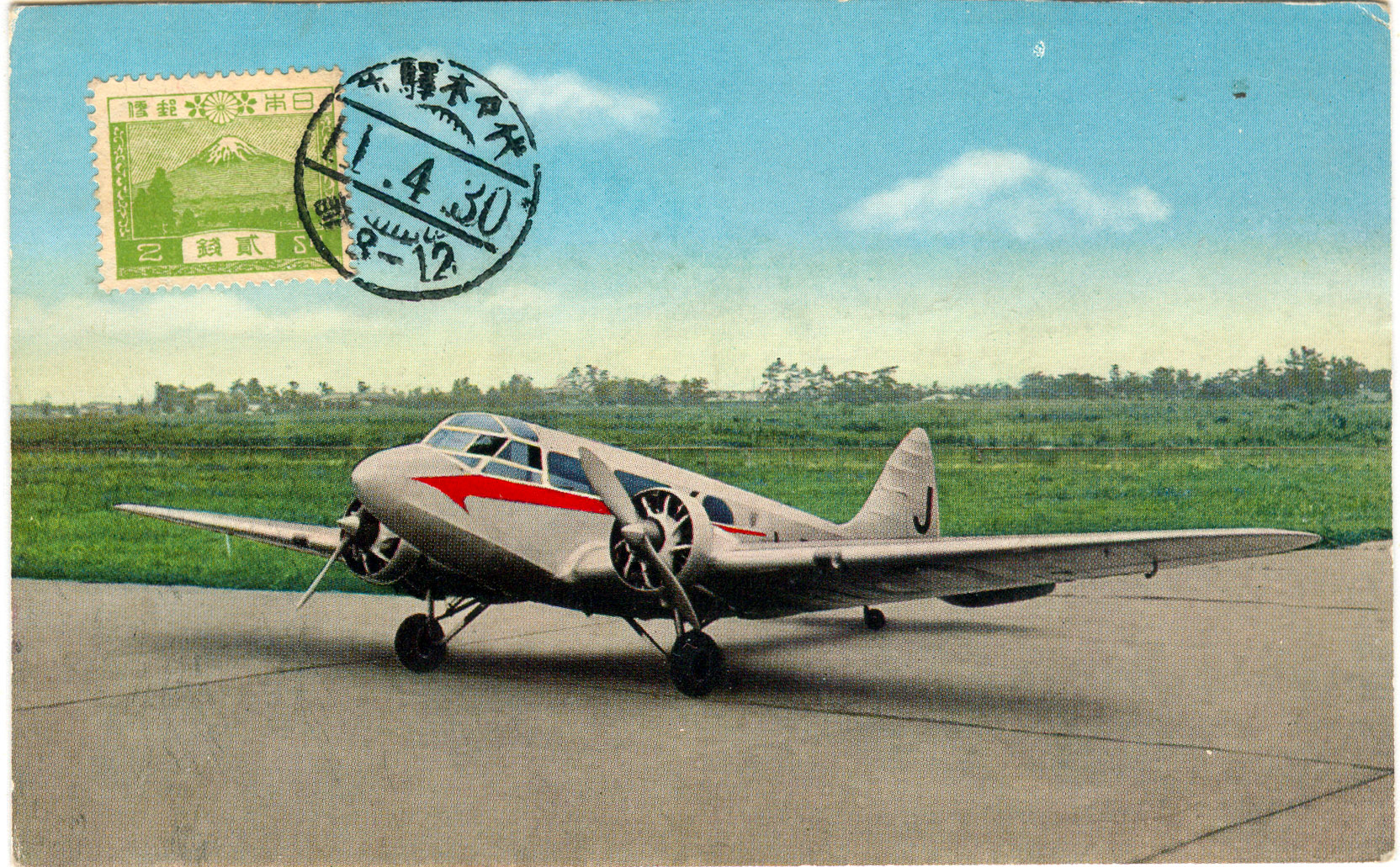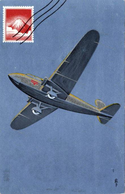 Mitsubishi/Gasuden Hinazaru passenger-transport airplane, c. 1940, in the livery of the Japan Postal System. The Hinazuru was manufactured under license, replacing the Airspeed Envoy it resembled, in Japanese airline service. The stylized 〒 is still used on the signs of post offices and on post boxes, and is derived from the Japanese word teishin (“communication”).
