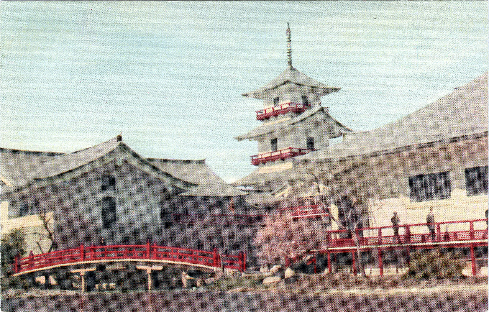 “Amidst an exotic Japanese setting of terraced gardens, with plants and shrubbery and many varieties of trees that shade the placid lagoons, Japan Pavilion, an original combination of the architecture of a Feudal Castle and a Samurai house of the 17th Century, stands in majestic splendor as one of the finest and most interesting sights of the Golden Gate International Exposition at Treasure Island.”